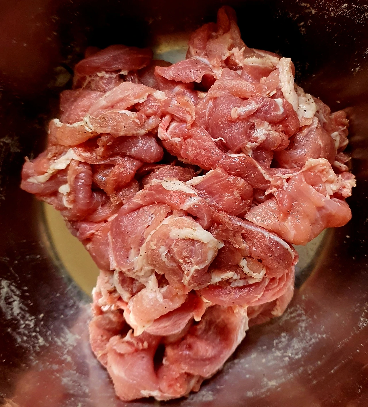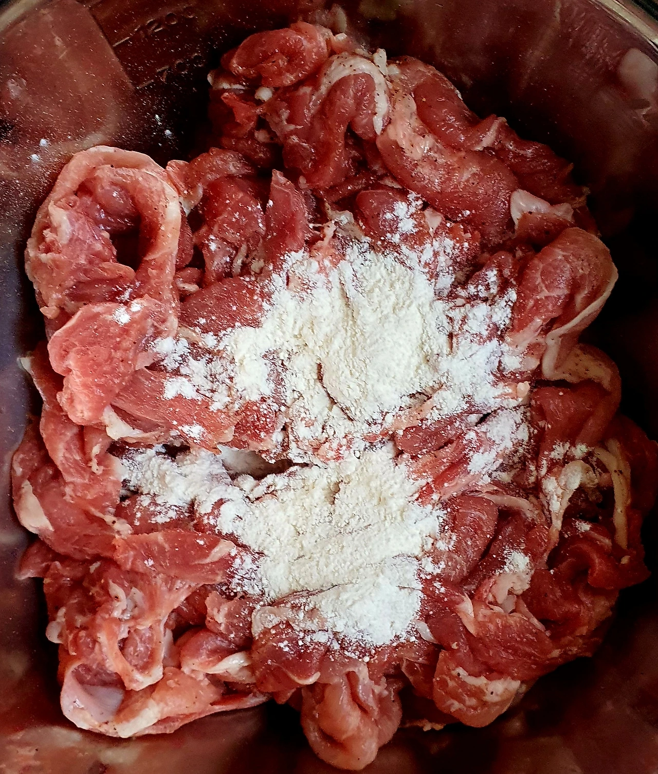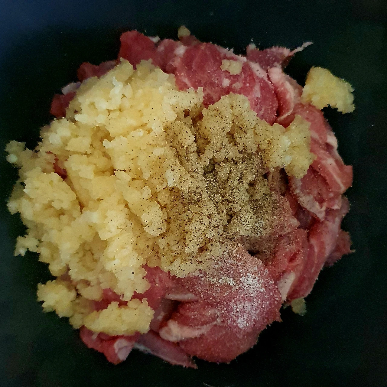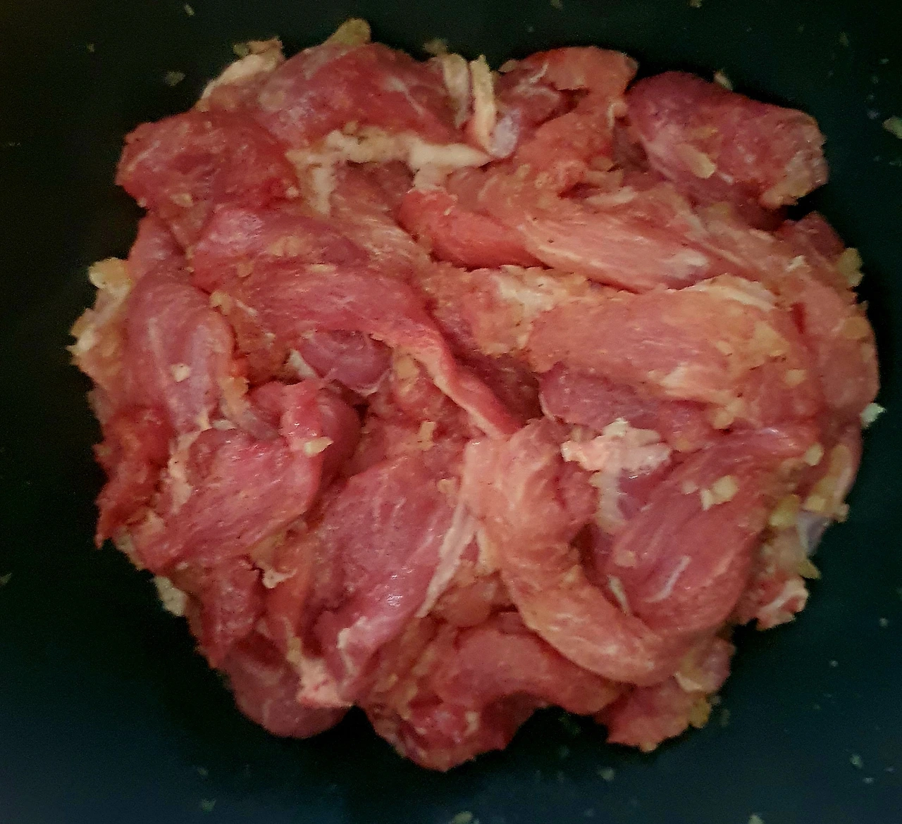 • 얇게 썬 돼지고기 불고기감을 간 마늘. 소금. 후춧가루로 밑간을 해서 미리 준비해 둔다.