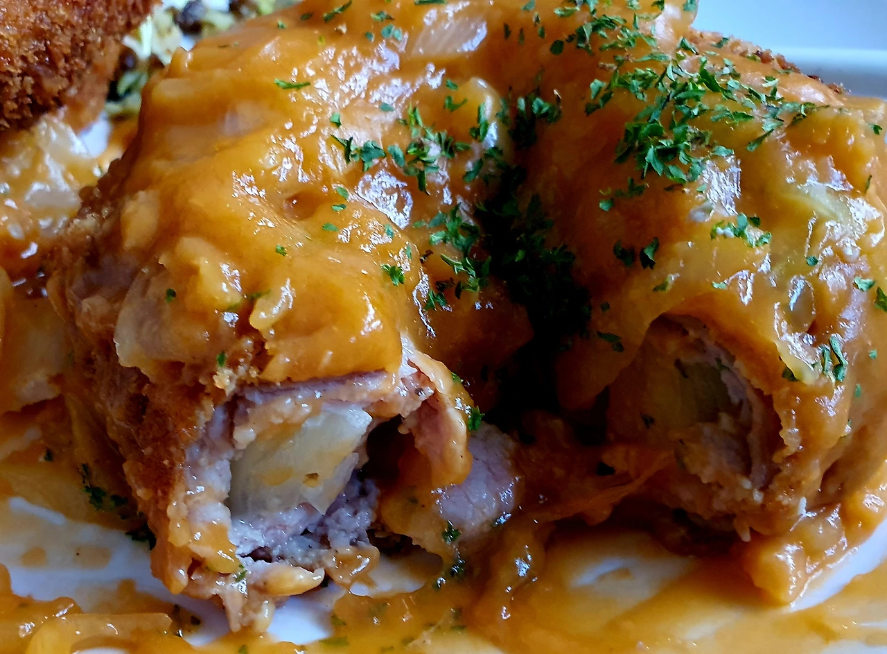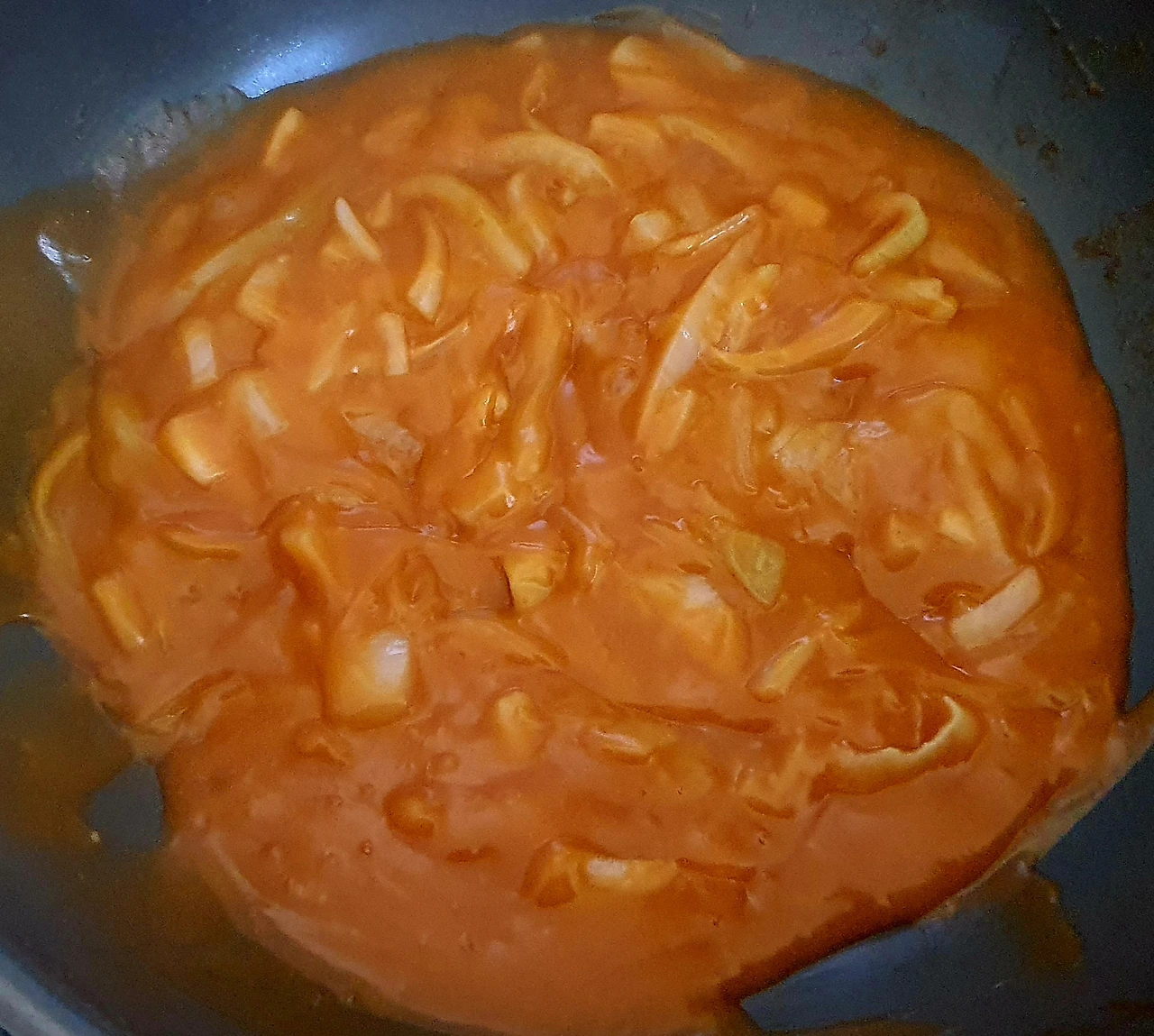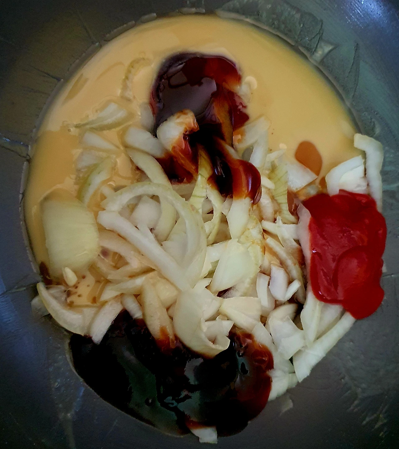 • 만들어진 루에 채 썬 양파. 데리야끼소스. 국물진다시. 케첩. 꿀을 넣고 끓이며 물로 농도를 조절해서 소스를 만들어준다.