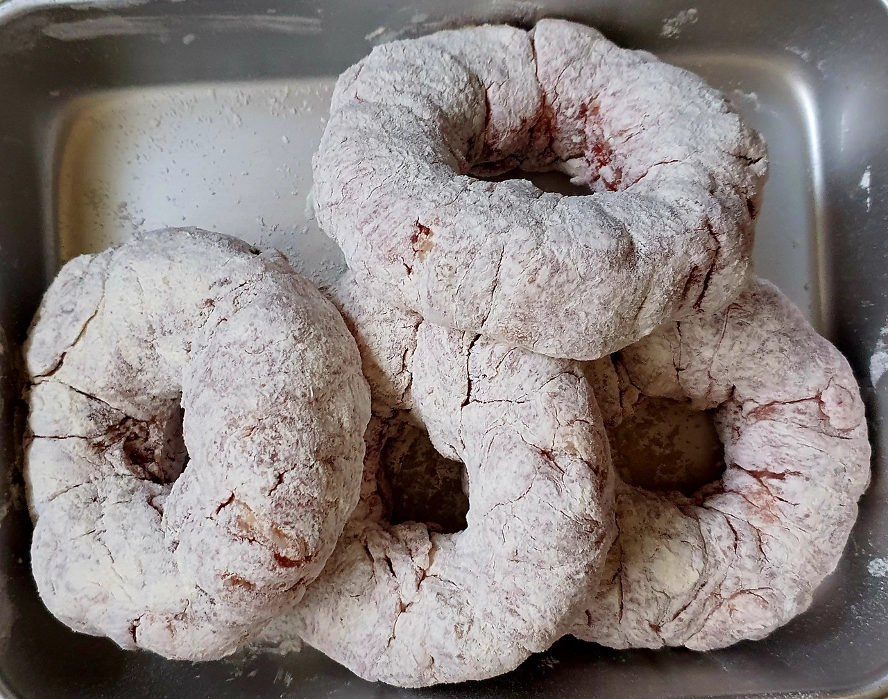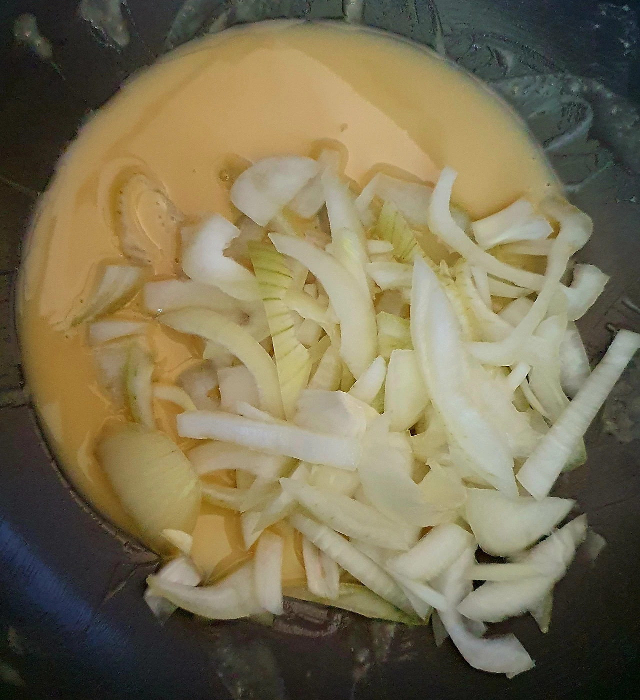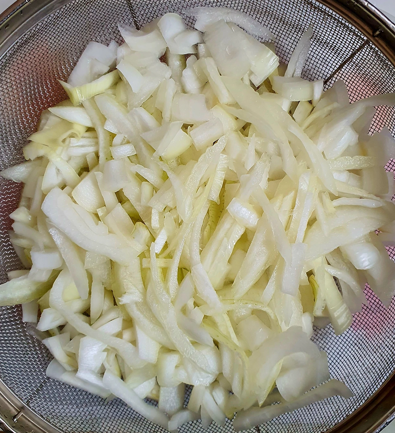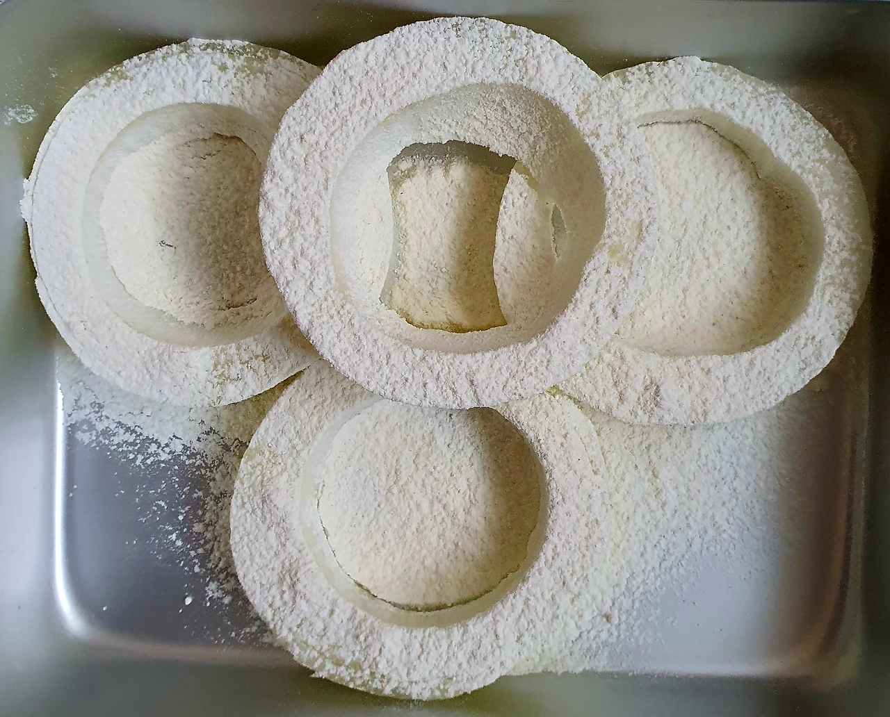 • 양파는 동그랗게 썰어서 전분가루를 입혀서 준비하고 남은 부분은 채를 썰어 둔다.