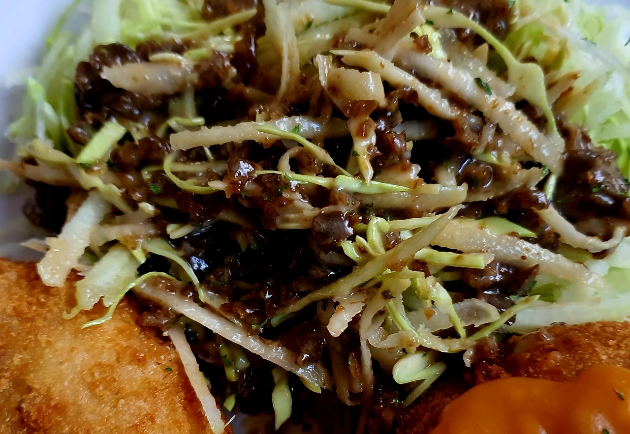 • 완성용기에 양파링 돈가스를 올리고 위에 준비한 소스를 뿌려주고 양배추. 콜라비 샐러드도 한편에 올리고 드레싱을 올려준다.