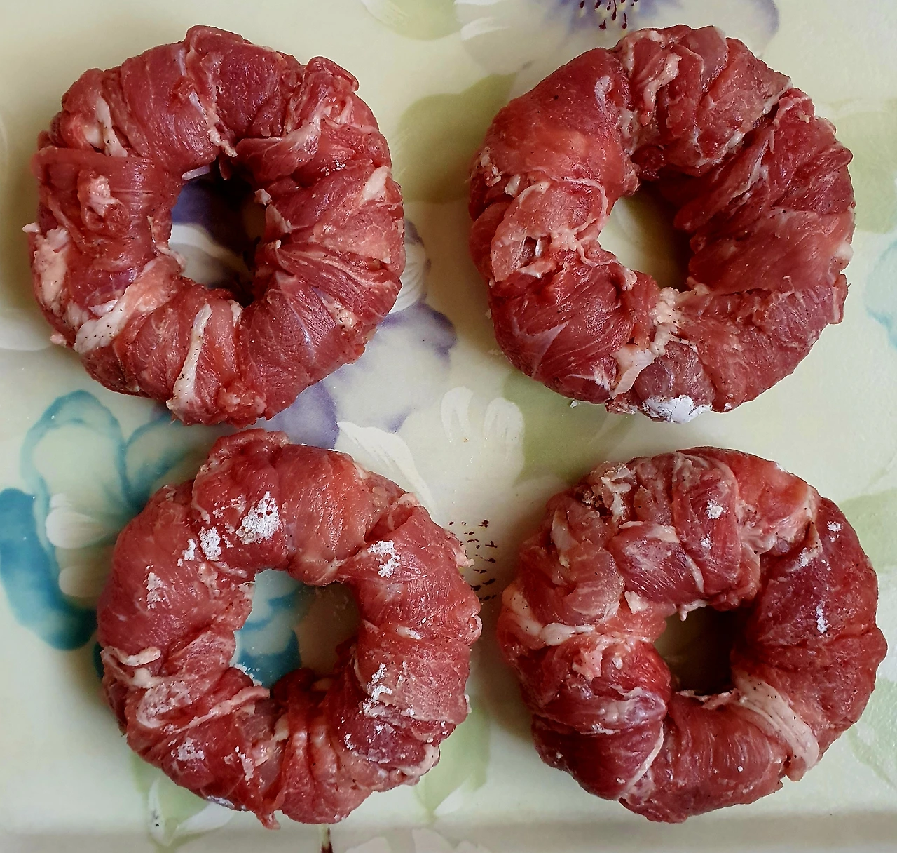 • 동그랗게 썬 양파에 미리 준비한 돼지고기에 전분가루 1큰술만 넣고 조물조물 주물러 돌돌 말아준 다음 겉에 튀김가루를 골고루 뿌려준다.