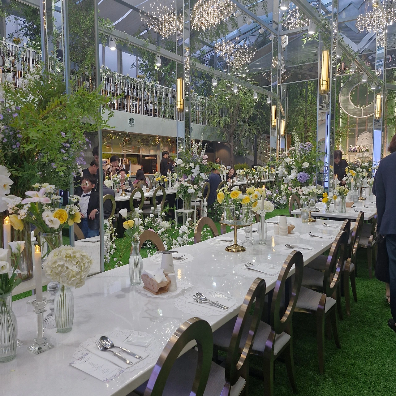 코로나 이후 웨딩홀이 많이 사라져서 장소를 잡기가 어렵다고들 한다. 사촌동생의 결혼식 장소가 호텔이 아니라서 미니결혼식을 하는 곳인 줄 알았는데, 미니스러운 곳은 아니었다. 내부는 요즘 카페 분위기. 화려한 교회스타일을 우아하고 아름답게 꾸민 공간이 인상적이다. 좁은 통로를 통해 들어가서 반짝반짝 빛나는 홀이 열리는 콘셉트가 조용히 초대받은 비밀스러운 파티에 온 기분이다. 통로를 따라 전시된 신랑신부의 사진을 보는 일 또한 행복을 예감하게 한다.