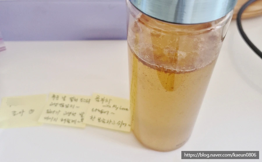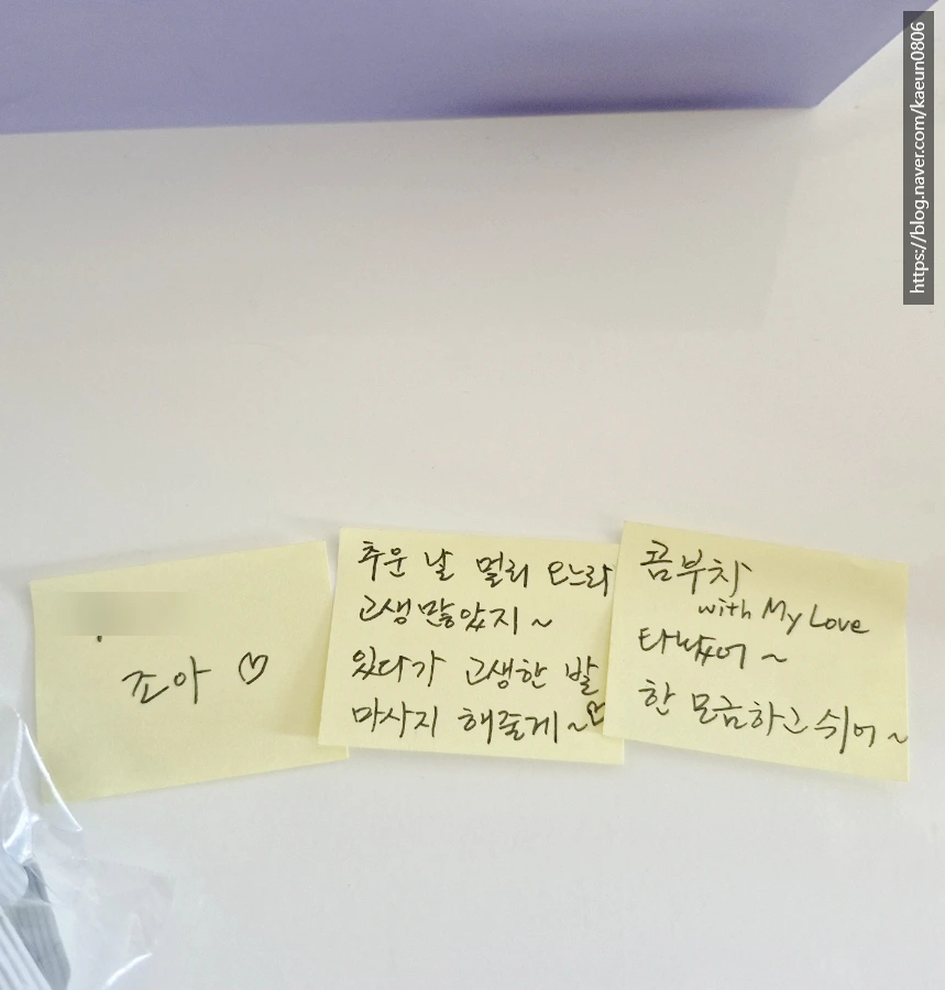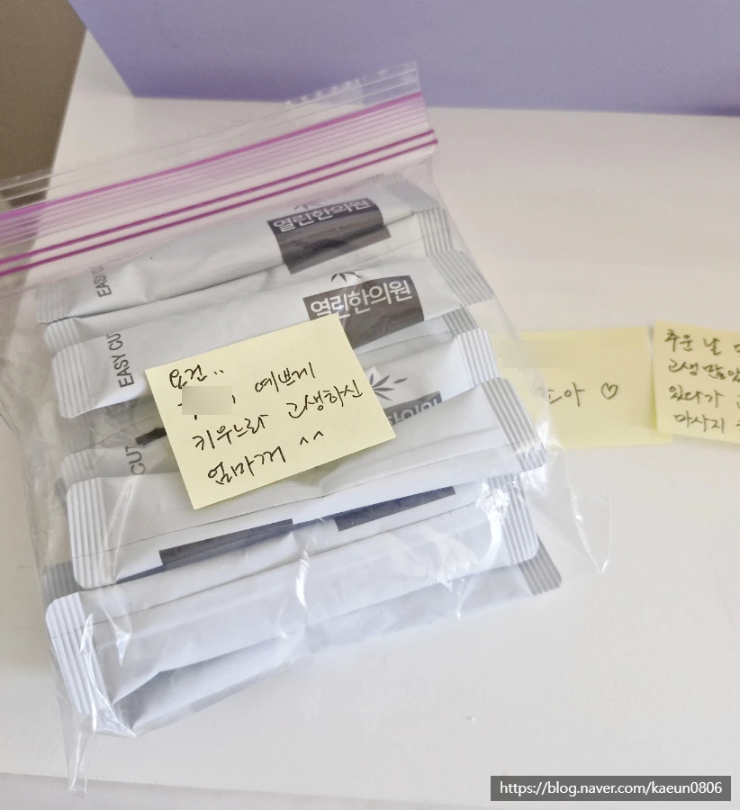 현관문 손잡이에 붙은 '** 좋아'부터 시작해서 먼 길 오느라 고생했다며 만들어 놓은 비타민 콤부차에 붙은 포스트잇. 건강 챙기라며 주문해 둔 한약에 붙은 메모에 엄마 소화제까지 챙기는 살뜰함. 거울과 옷걸이에 붙은 재미있는 멘트까지. 출근하기에도 바쁜 아침에 이런 이벤트까지 생각할 수 있었을까. 기분이 활짝 펴진 만큼 감동이 몰려왔다. 아기자기하게 잘 챙기지 못하고, 이벤트에 약해서 깜짝 놀라게 하는 재주가 없는 나로서는 미처 생각도 못할 일이라 감동은 더 컸다.