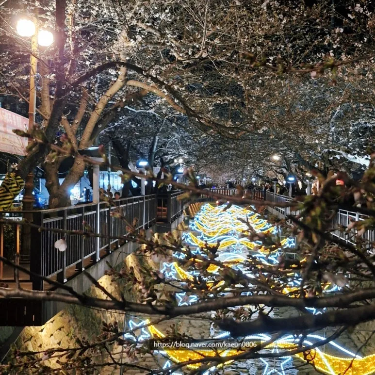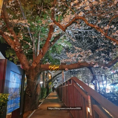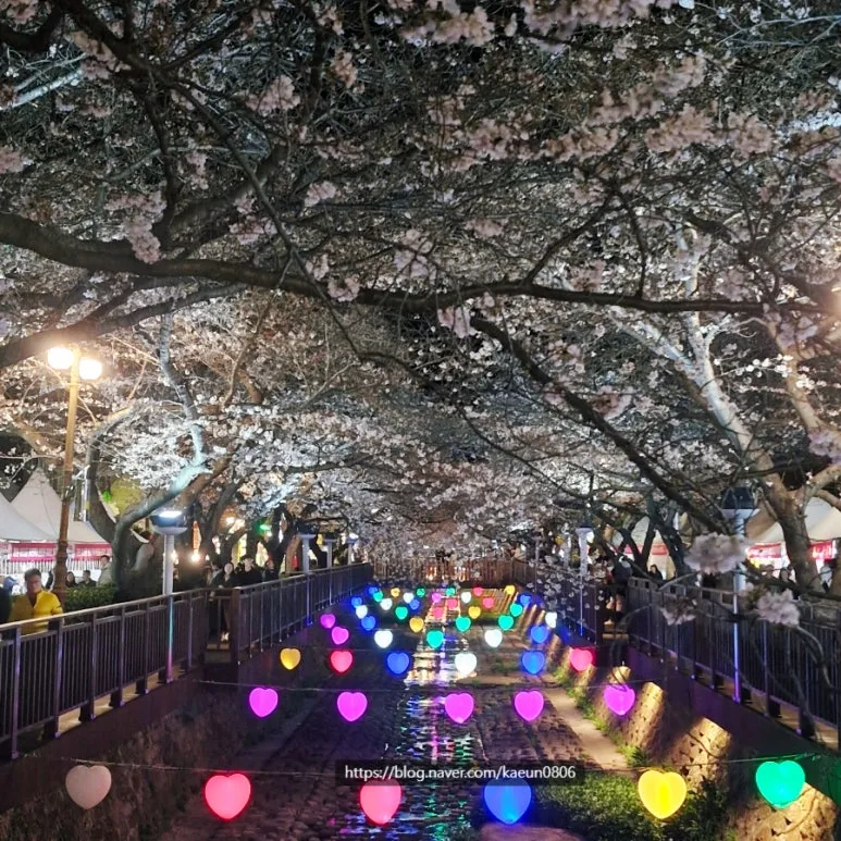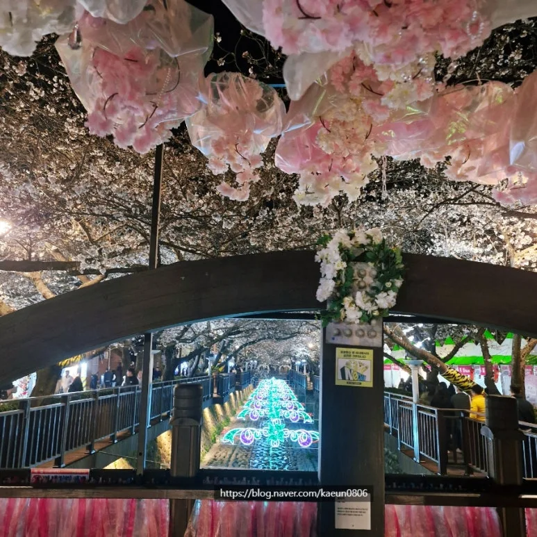축제의 기쁨보다 벚꽃 고유의 자태를 누리고 싶었다. 여좌천로망스거리가 예쁘다고 하여 장소를 옮겼다. 내리자마자 펼쳐진 소담스러운 장면에 할 말을 잃었다. 거대한 공원을 따라 화려하게 펼쳐진 여의도의 벚꽃도 감탄스러웠지만, 좁은 천을 따라 펼쳐진 여좌천의 벚꽃길은 앙증맞고 귀여웠다. 여의도가 여왕이라면 이곳은 공주님의 길처럼 사랑스러웠다. 공주님을 보좌하면서 더욱 빛나게 해주는 시종처럼 과하지 않은 장식물의 조명이 벚꽃을 탐스럽게 만들어 주고 있었다. 좁은 데크길을 따라 걸으며 테마에 따라 달라지는 아이템에 '로망스'란 단어의 온도가 절로 체감되었다. 어떠한 사랑이건 사랑이 활짝 피어날 수밖에 없는 풍경이 눈에 가득 펼쳐졌다.