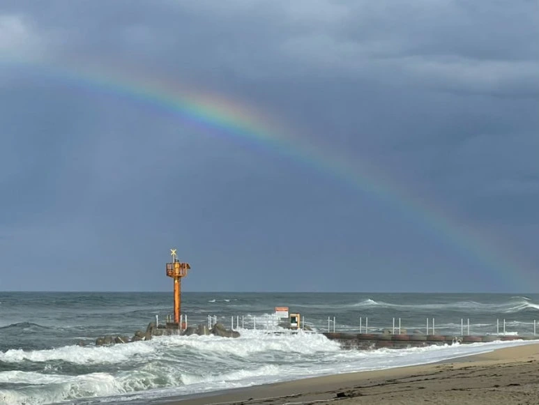그런데 정확히 3분 정도 지났을까. 갑자기 등 뒤가 따뜻해지고 눈앞이 환해졌다. 어리둥절한 채 고개를 들어보니 그 짙은 먹구름 사이로 햇빛이 들어오고 있던 것이다. 그러곤 정말 믿기지 않게도 바다 저편에 무지개가 피어나 있었다.