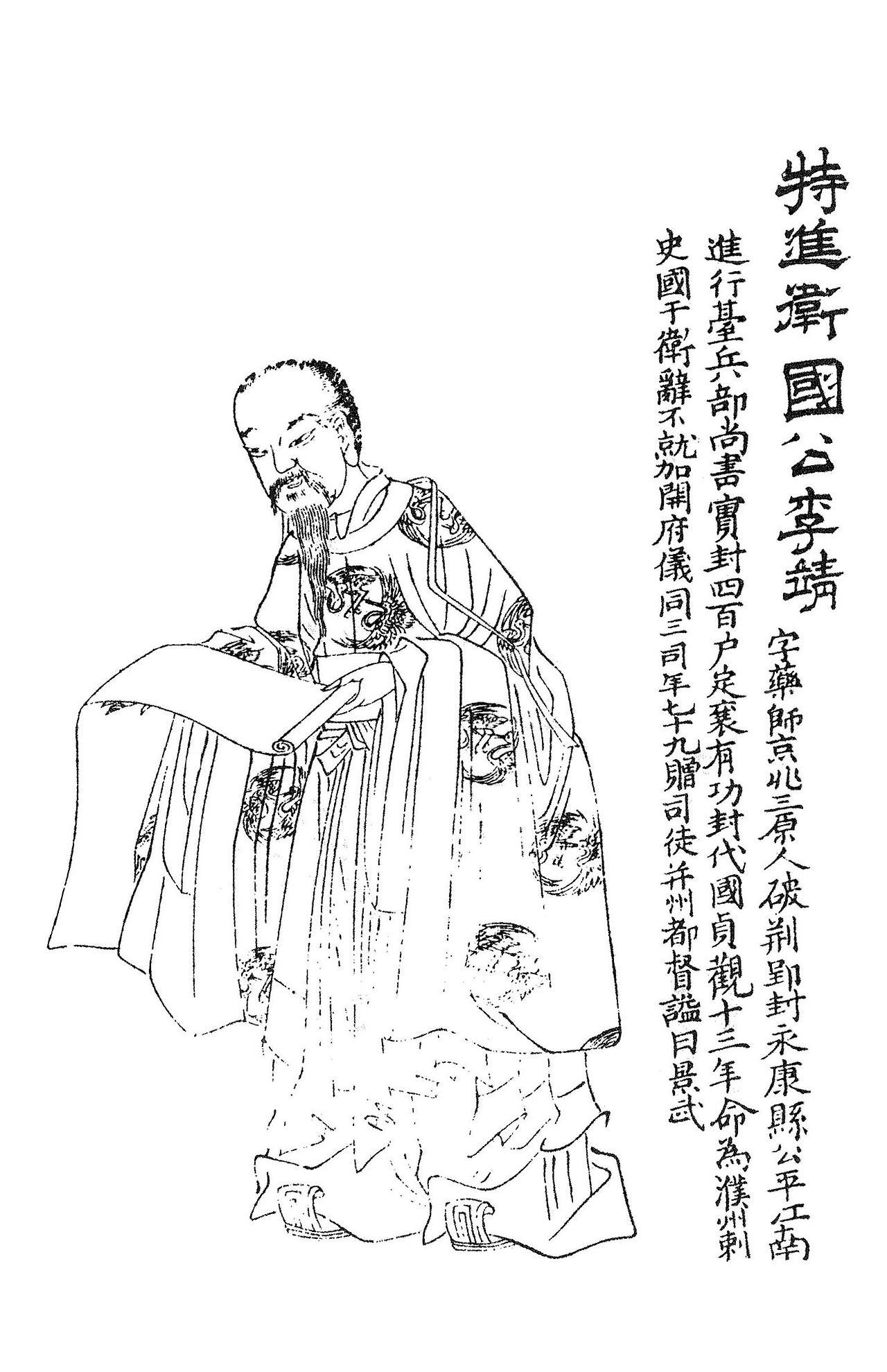 도면. 이정은 용병과 모략에 뛰어난 장수로 태종 이세민의 담대한 ‘석원’에 감격하여 혁혁한 공을 세우는 활약으로 보답했다. 태종과 그가 나눈 군사와 용병 등에 관한 대화집이 《이위공문대(李衛公問對)》이다.