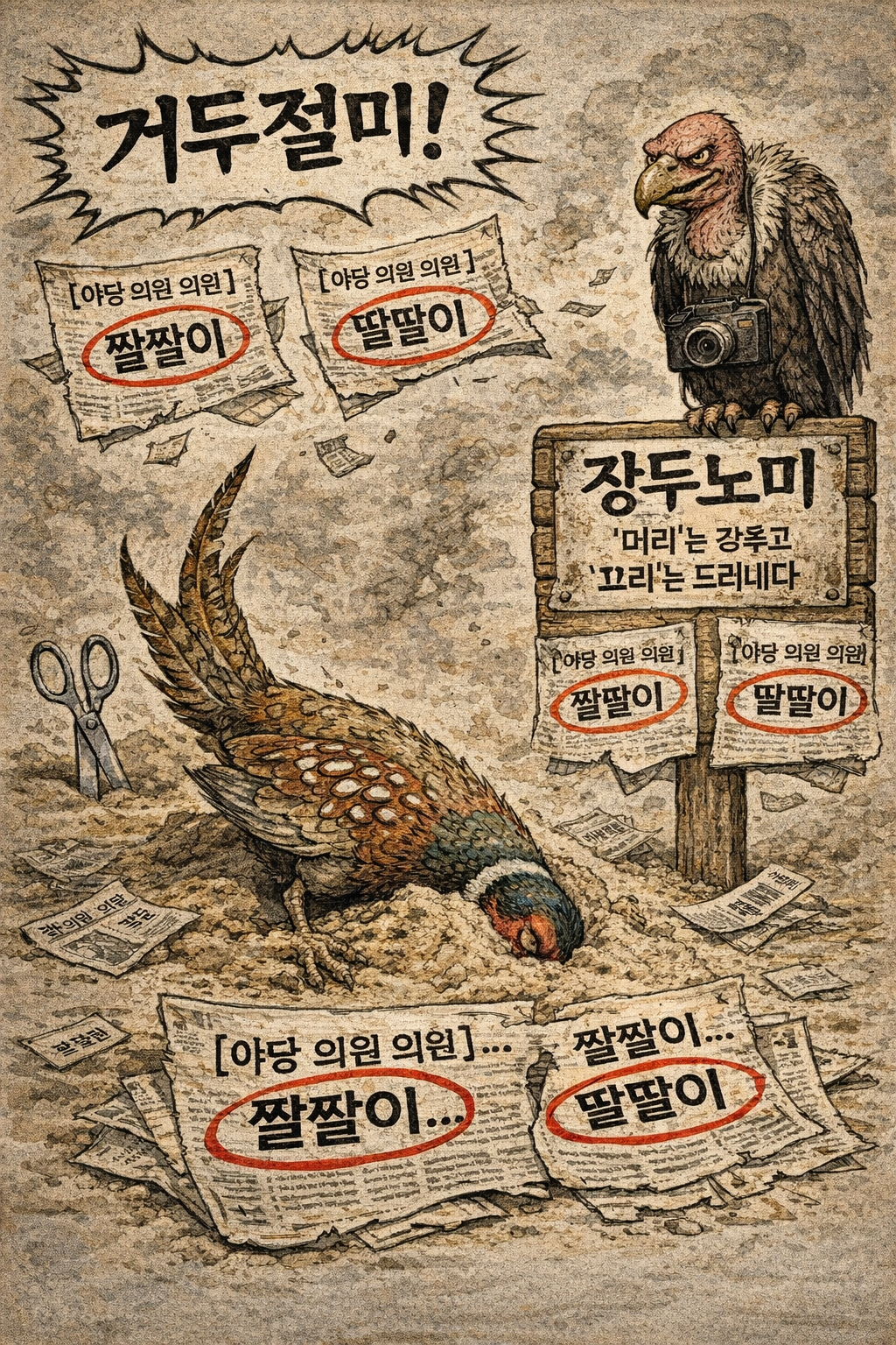 ‘거두절미’는 취재하지 않고 기사를 쓰는 불량 언론 ‘언간’의 주요 수법이기도 하다. 남이 쓴 기사나 글과 말 등을 카피하면서 앞뒤는 물론 아무 곳이나 잘라 붙이는 수법이 그것이다. 이렇게 몇 번 거치면 원래 기사와는 완전히 다른 기사가 되어 버리는 일이 적지 않다. 말하자면 핵심을 찌르는 요약이 아니라 핵심을 흐리기 위한 요사스러운 글을 만들기 위해 ‘거두절미’를 악용한다. 문제는 ‘언간’의 ‘거두절미’는 마치 머리 나쁜 꿩이 대가리만 땅에 처박고 있는 꼴이라는 사실이다. 이를 사자성어로 ‘장두노미(藏頭露尾)’라 한다. ‘머리만 감추고 꼬리는 드러내다’는 뜻이다. 눈 밝은 사람이라면 ‘거두절미’하고 남은 ‘몸통’을 보는 것이 아니라 잘라낸다고 잘라낸 그 ‘머리’와 ‘꼬리’를 보고 그 ‘몸통’과 맞춘다. 깨어있는 시민들의 수준이 ‘언간’을 한참 앞질렀다는 사실을 ‘언간’과 꿩 대가리 같은 간신 부류들만 모르고 있다.