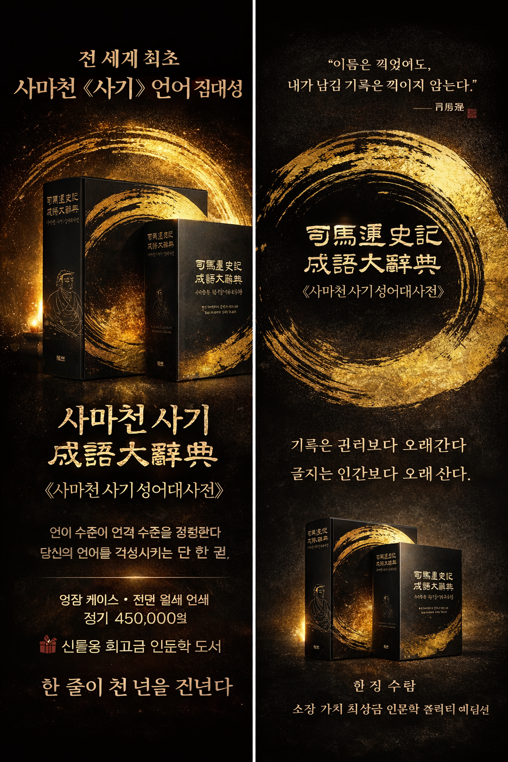 김영수 저자의 《사마천사기성어대사전》(2026, 창해)은 《사기》 130권에 등장하는 1,400개 이상의 성어, 명언, 고사성어를 집대성한 세계 최초의 사기 전문 성어 사전입니다. 30년 연구 성과를 담은 2,816쪽의 대작으로, 인간 본질과 역사, 처세의 지혜를 다룬 인문학의 보고입니다.