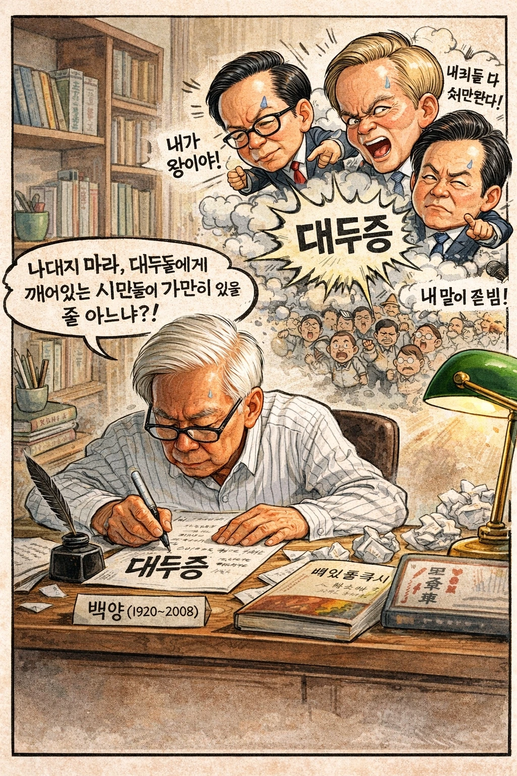 백양 선생의 권력자 비판에서 가장 독특하고 눈에 띄는 표현들 중 ‘대두증’이라는 것이 있다. 바로 옮기자면 ‘자신의 머리(대가리, 능력)가 (남보다) 훨씬 크다고 착각하는 증상’ 정도가 된다. 우리가 쓰는 표현들 중 가장 비슷한 것이 ‘과대망상증’이다. 과대망상증에 관한 사전적 의미는 다음과 같다.