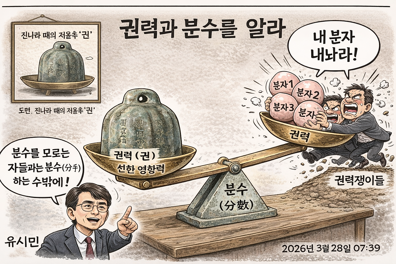 이 분수(分數)를 모르는 자들, 다시 말해 자기 몫이 아닌 분자를 더 차지하려는 저급한 권력론에 사로잡힌, 그래서 잘못을 인정하지 않고 않으려는 자들과는 어떻게 해야 하나? 분수(分手)하는 수밖에 없다. 잡았던 손을 놓고 헤어지는 것이다. 커진 분모의 힘(크기)이 자연스럽게 분자를 줄이거나 다른 분자로 대체할 것이다. 커진 분모의 힘, 그것이 바로 나누어진 힘, 즉 ‘권력’이다. 어쨌거나 이 일로 한 가지 분명해진 사실은 분모가 커졌다는 것이다. 안타깝게도(?) 유시민 작가의 권력(영향력)도 그만큼 더 커졌다. 아이구, 이 멍충이들아!(2026년 3월 28일 07:39)
