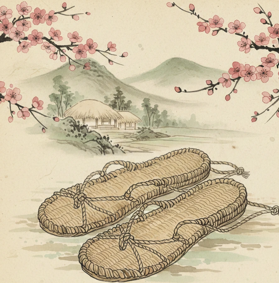 비단신 고이 얹어 놓고, 발 편한 짚신을 꺼냈다.