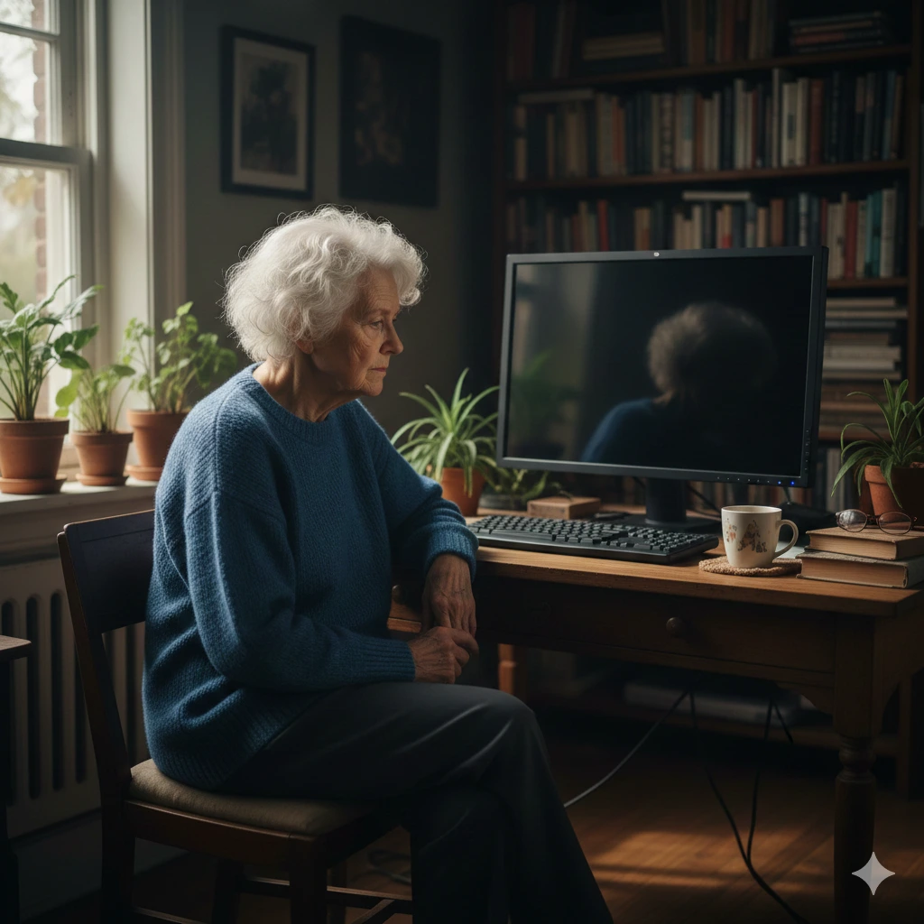백발의 노파가 불이 켜지지 않은 까만 모니터와 마주 앉아 있다.