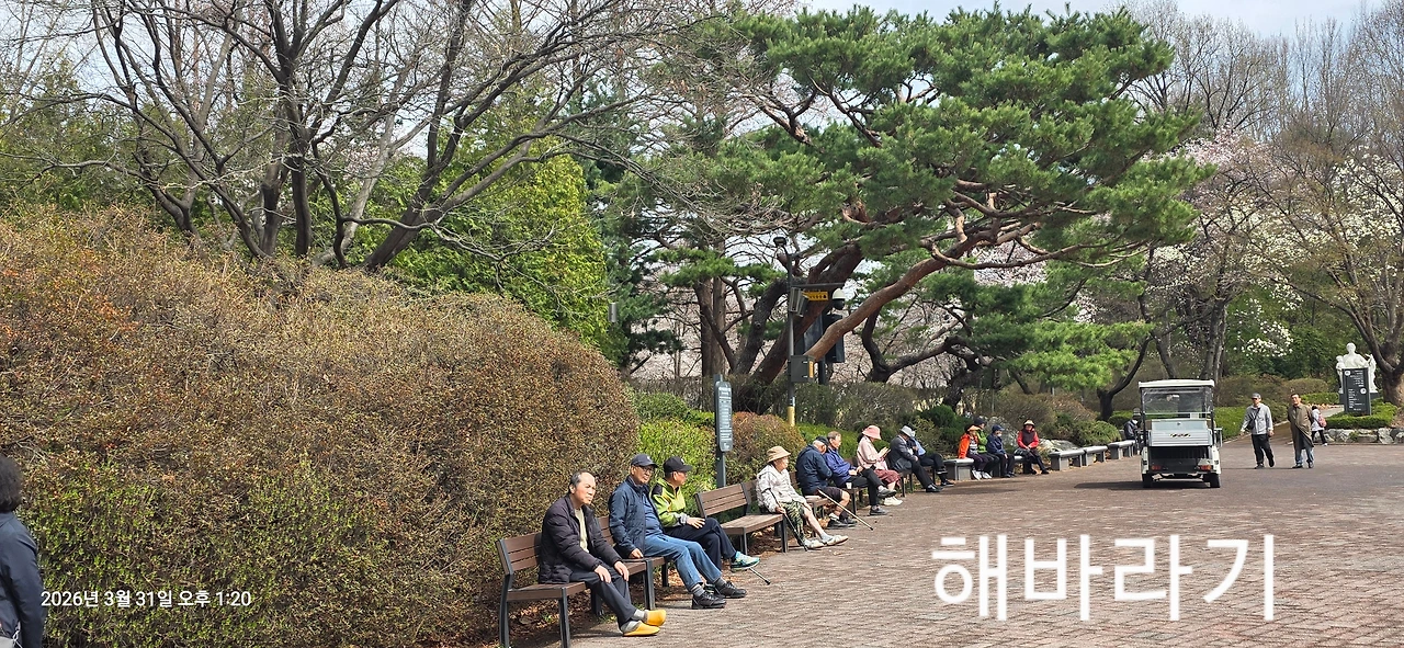 길 가에 길게 놓인 벤치에 앉아 해바리기 하는 노인들,