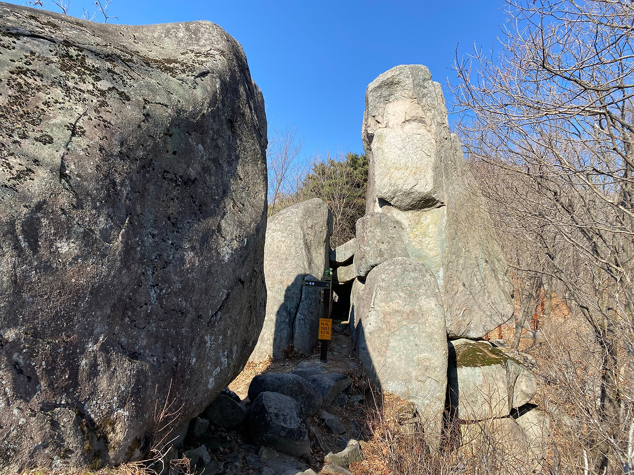 가산봉 성곽 위로 난 길은 겨우내 얼었던 땅이 녹아 질퍽이는 구간과 꽁꽁 언 구간의 반복이다. 험준한 지형에 지어진 성곽과 기암괴석이 어우러진 풍광에 발걸음이 잡히며 약 2시간 정도 걷자니 웅장한 바위가 앞을 막아선다. 한눈에 봐도 잘생긴 풍채가 예사롭지 않다. 할매할배바위란다. 예전 자식이 없던 부부가 이 할매할배바위에 치성으로 공을 들여 아들을 얻었다는 전설이 있단다. 이 설명을 보기 전엔 할매할배바위 형상이 할매할배를 닮았나 해서 요리조리 상상력을 동원하여 살펴보았으나 설명을 보고 나니 조금은 이해가 간다.