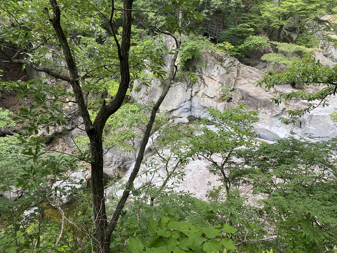 폭포가 어찌나 자주 나오는지 돌아서면 폭포요 돌아서면 폭포다. 지루할 새가 없다. 이번엔 네 번째 잠룡폭포다. 잠룡폭포도 등산로에서는 잘 보이질 않는다. 전망데크에서 나무 틈으로 겨우 보이는 게 다이다. 폭포 아래 물속에 승천하지 못한 용이 살았다 하여 잠룡폭포라 하니, 너무 쉽게 보여 용이 승천하지 못하면 안 될까 하여 수줍게 감춰져 있나 보다.