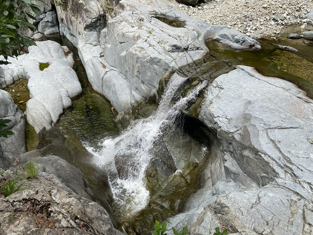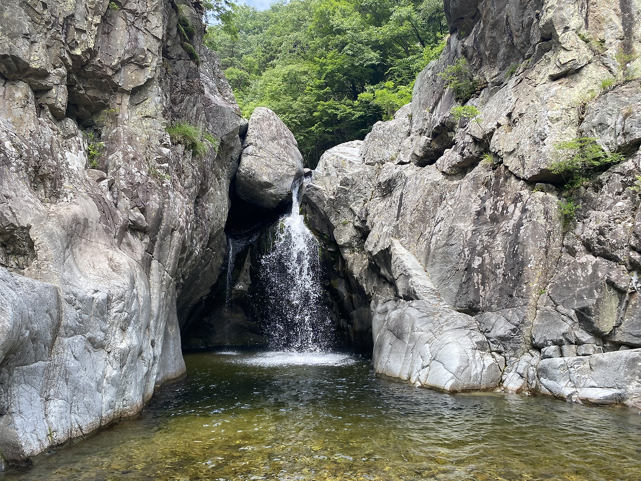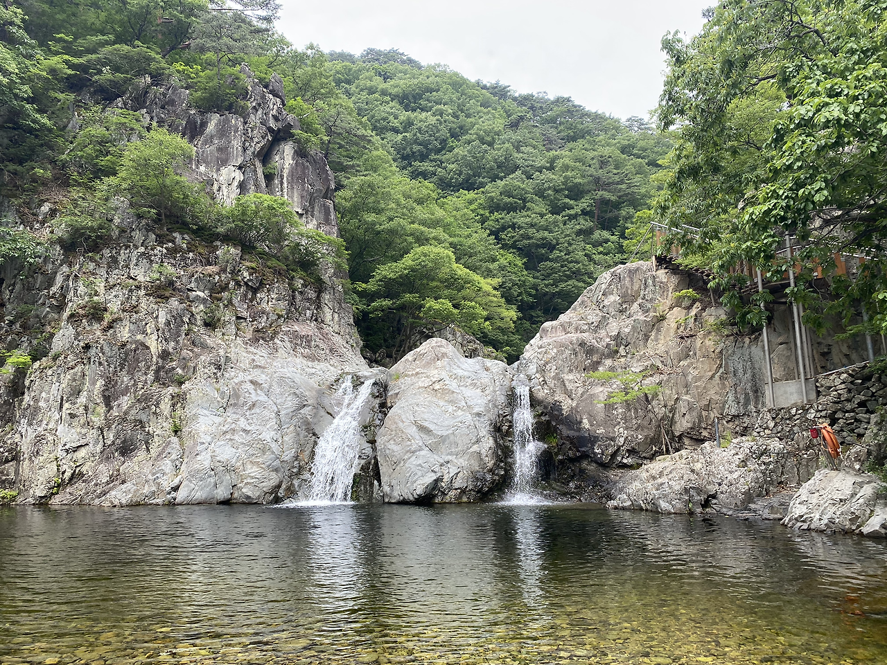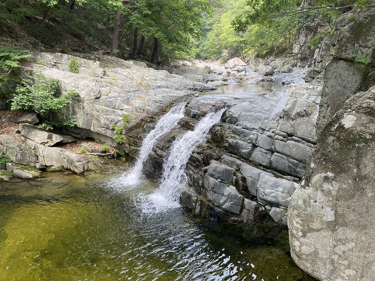 갈림길에서 5분 정도 걷노라면 첫 폭포인 상생폭포가 나온다. 예전에는 쌍폭이라 불렸다는데 지금은 상생폭포로 불린단다. 내가 보기엔 쌍폭이 더 직감적인데 두 물줄기가 경쟁하지 않고 서로의 길로 가는 것이 ‘같이 산다’하여 상생인가 생각해 본다. 그리 높지 않은 폭포임에도 폭포 아래는 엄청 깊다. 구명튜브를 준비해 둔 게 다 이유가 있다 싶다.
