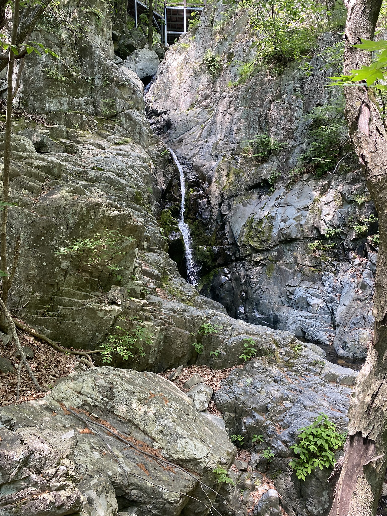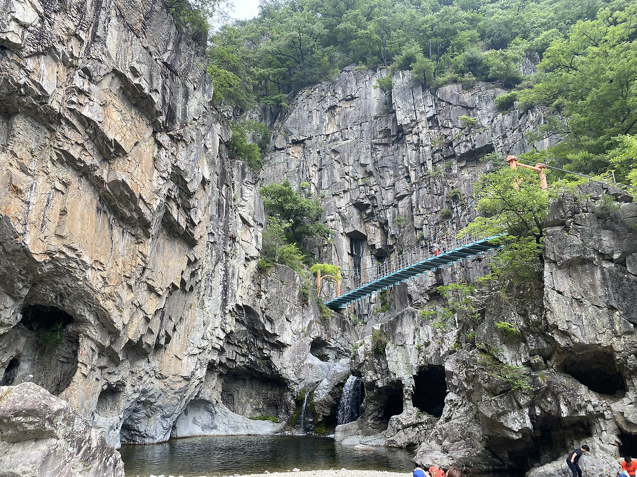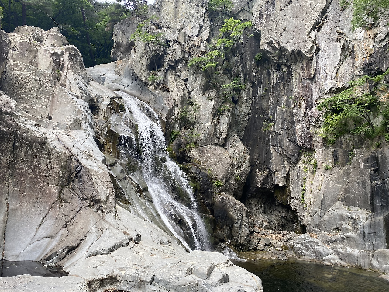 관음폭포 위 연산구름다리로 올라가면 일곱 번째 연산폭포가 나온다. 연산폭포는 일반적인 폭포 하면 떠오르는 이미지와 가장 닮았다. 높이 하며, 폭포 옆을 에워싼 바위 절벽하며 모든 것이 폭포스럽다. 다만 아쉬운 것은 관음폭포를 보고 바로 보게 되니 연산폭포 자체를 온전히 감상하기엔 앞의 감흥이 남아있는 것이 조금 미안하다.