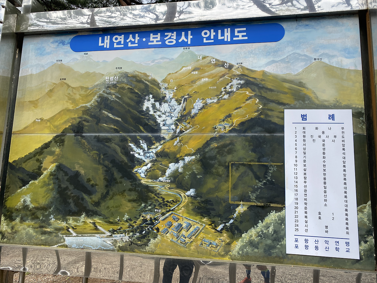 보경사 산문을 지나 절 마당 앞 광장에 포항산악연맹에서 설치한 안내도가 있다. 일반 지도로는 전체적인 산세를 파악하기 어려운 것을 사실적 그림으로 잘 보여주는 것이 마음에 쏙 든다.