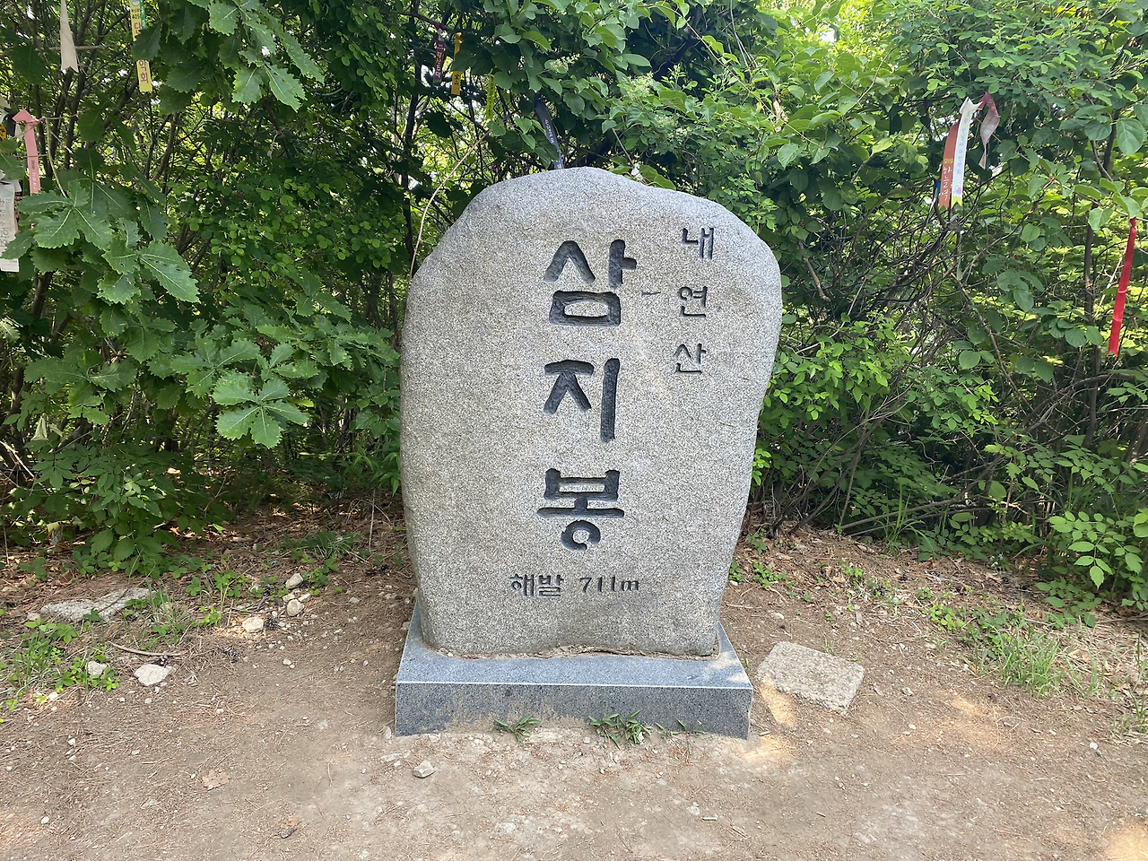 향로봉 정상에 도착하니 시간은 어느덧 오후 2시, 정상에서 늦은 점심으로 삼각김밥 한 개를 허겁지겁 먹고는 서둘러 하산길에 올랐다. 향로봉에서 삼지봉으로 가는 능선길은 급하지도 오르내림도 없이 완만하다. 1시간여를 걸으니 삼지봉 표석이 나온다.