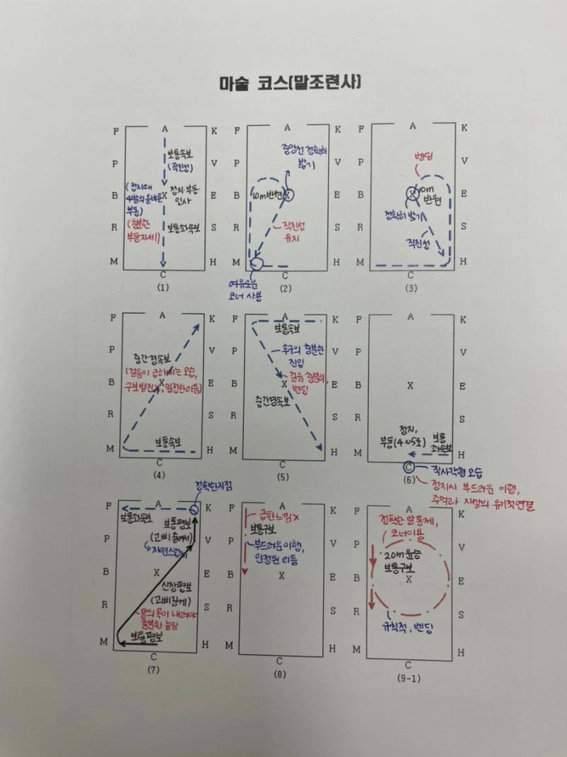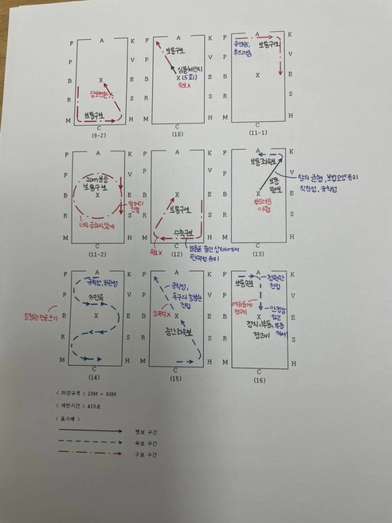연습할 때 경속보 신장을 할 때 보지 않고 반동을 맞추는 것이랑 구보에서 평보로 이행할 때 속보가 나오지 않고 부드럽게 이행하는 것이 문제였는데 시험 때는 반동을 한번 틀리기는 했지만 바로 바꿨다.