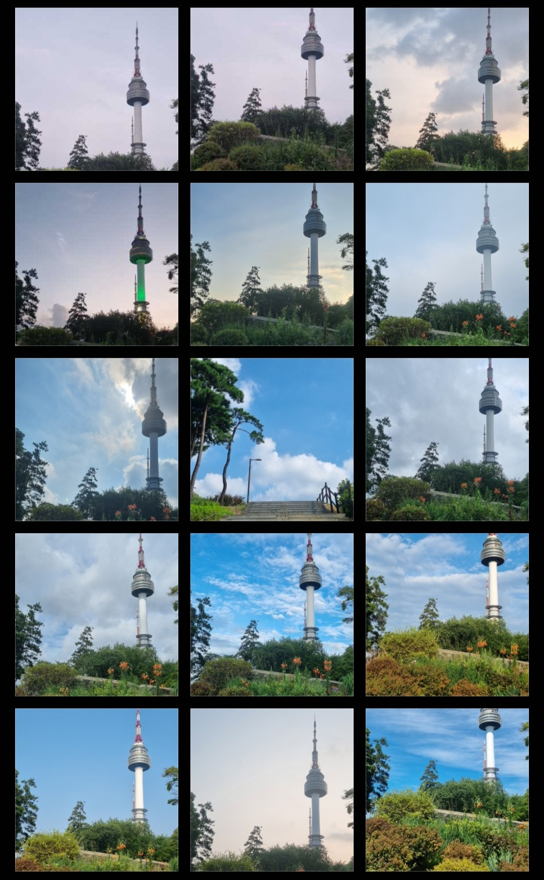 남산이 보이는 똑같은 장소에서의 사진촬영은 묘하게 큰 위로가 되었다. 안개가 끼어 보이지 않는 남산, 눈이 쌓인 남산, 화창한 남산, 비바람으로 희미하게 비 오는 남산, 수없이 다양한 남산의 사진을 보며 마치 인생 같다고 느꼈다. 같은 곳이지만, 다양한 상황이 있는 것처럼, 내가 처한 상황도 곧 지나갈 거라고 요동치던 내 마음은 전보단 잠잠해졌다. 남산을 오르는 것 마치 삶을 살아가는 것 같다. 칠흑같이 어두워 보이지 않아도 정상이 어디인지 알기에 묵묵히 오른다. 무더위에도 묵묵히 오르다 보면 늘 마주치는 그 남산에 내가 서있다. 어쩌면 인생에서 '묵묵히' 나아가는 것이 하나의 정답일 수도 있겠다는 생각이 든다.