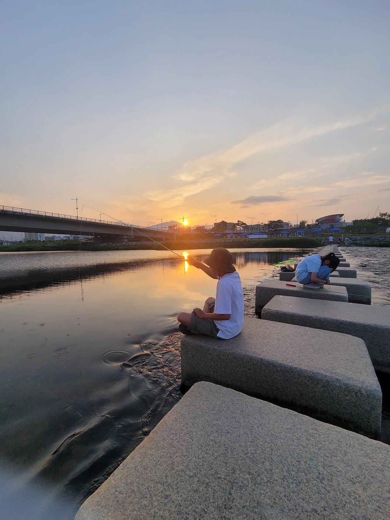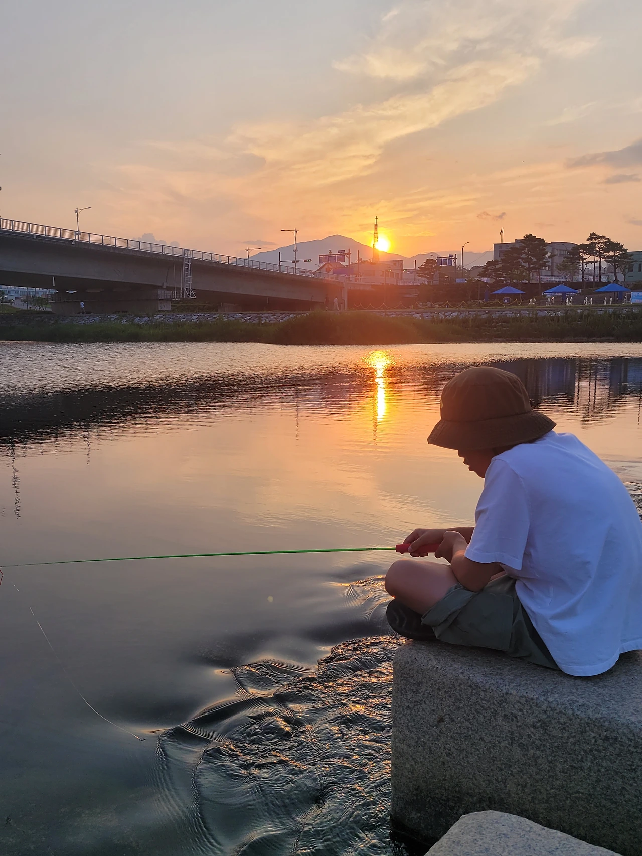 뜨거워 보이는 해와는 상관없이 세상 시원한 바람이 불어왔다. 지는 해에 시원하게 부는 바람. 신선이 따로 없는데. 혼자서 얼굴 탈까 싶어 모자까지 쓰고 눈으로만 아이들을 보고 있다.