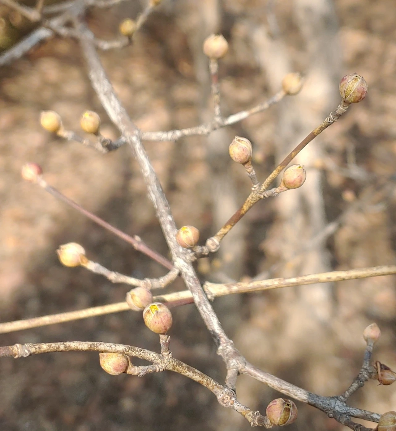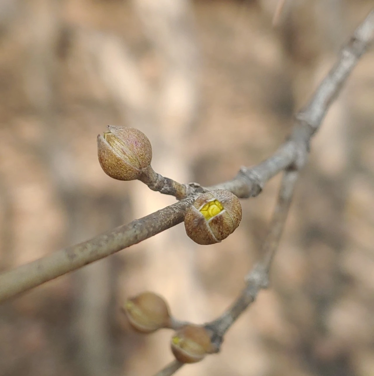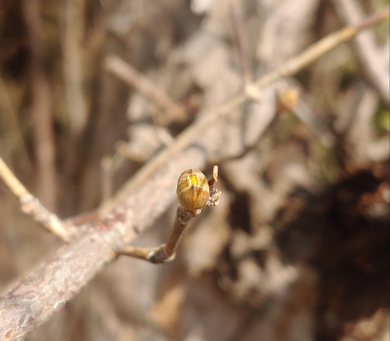 살짝 열린 산수유 꽃봉오리.
