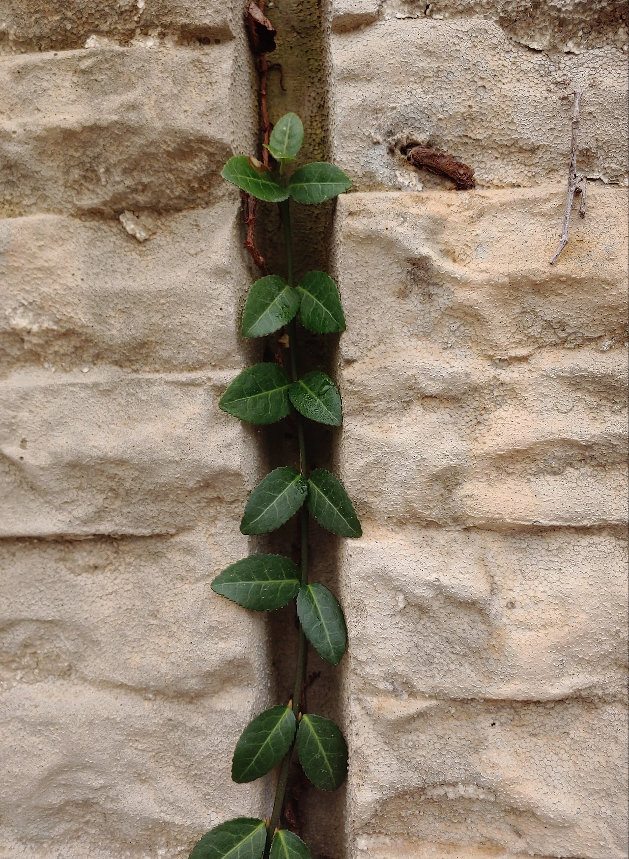 겨울 담벼락의 줄사철나무.
