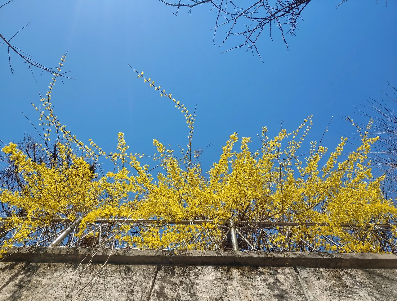 담장 위의 개나리꽃.