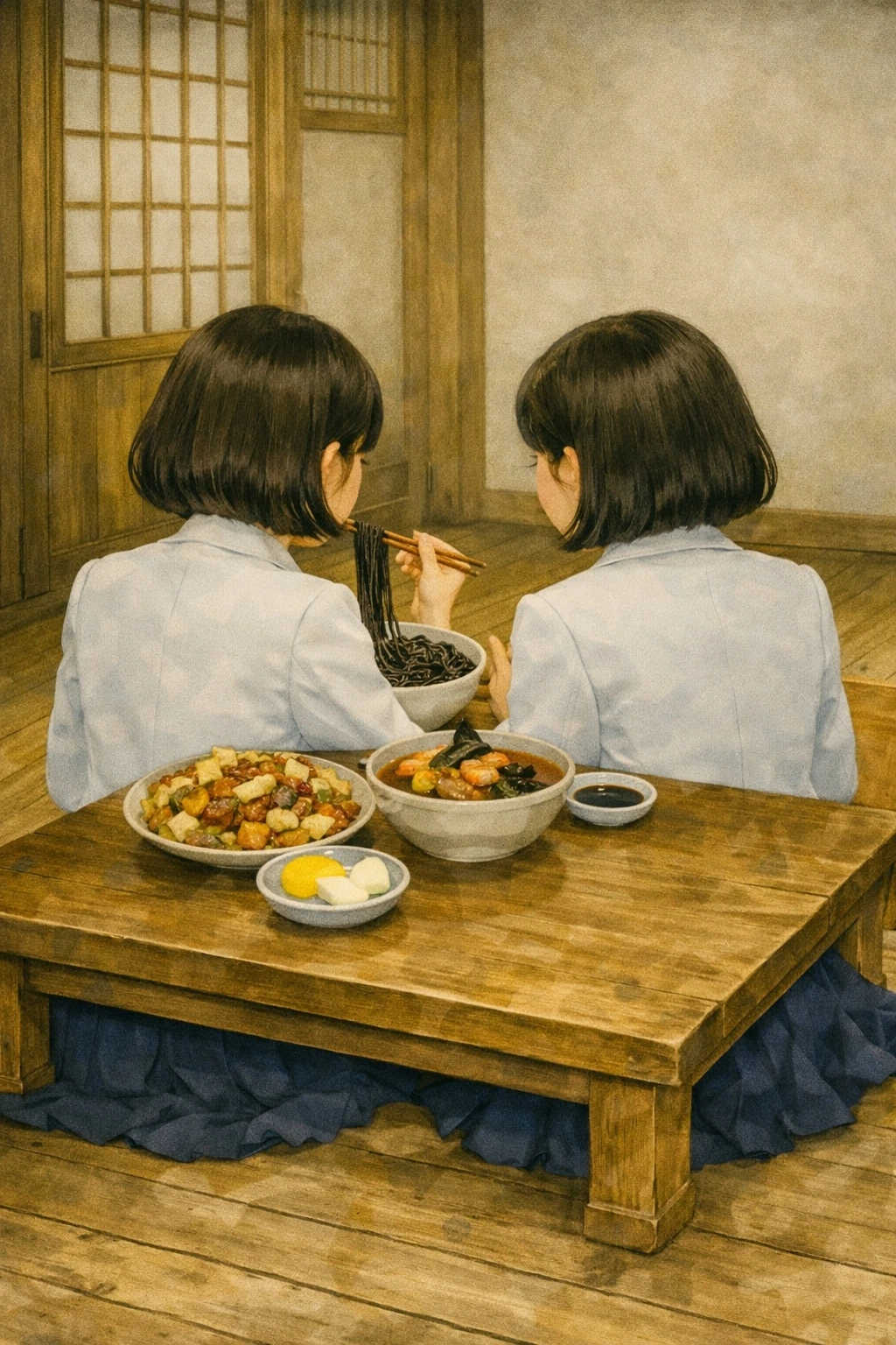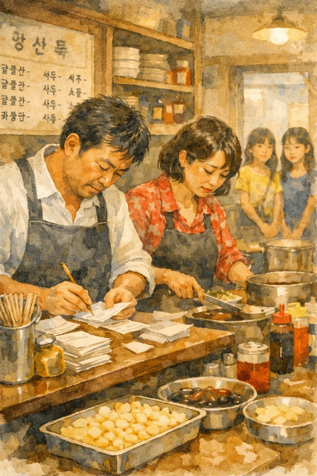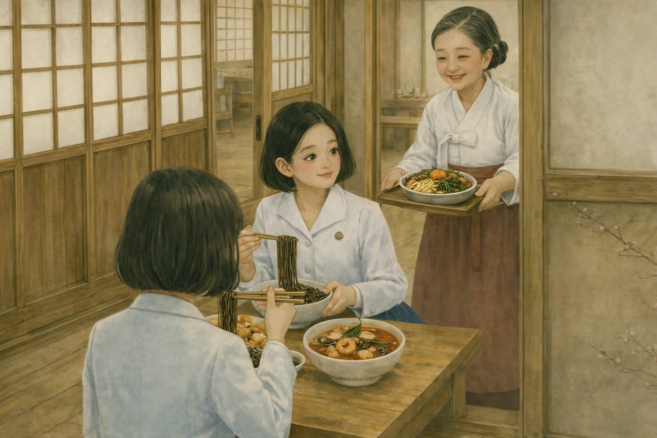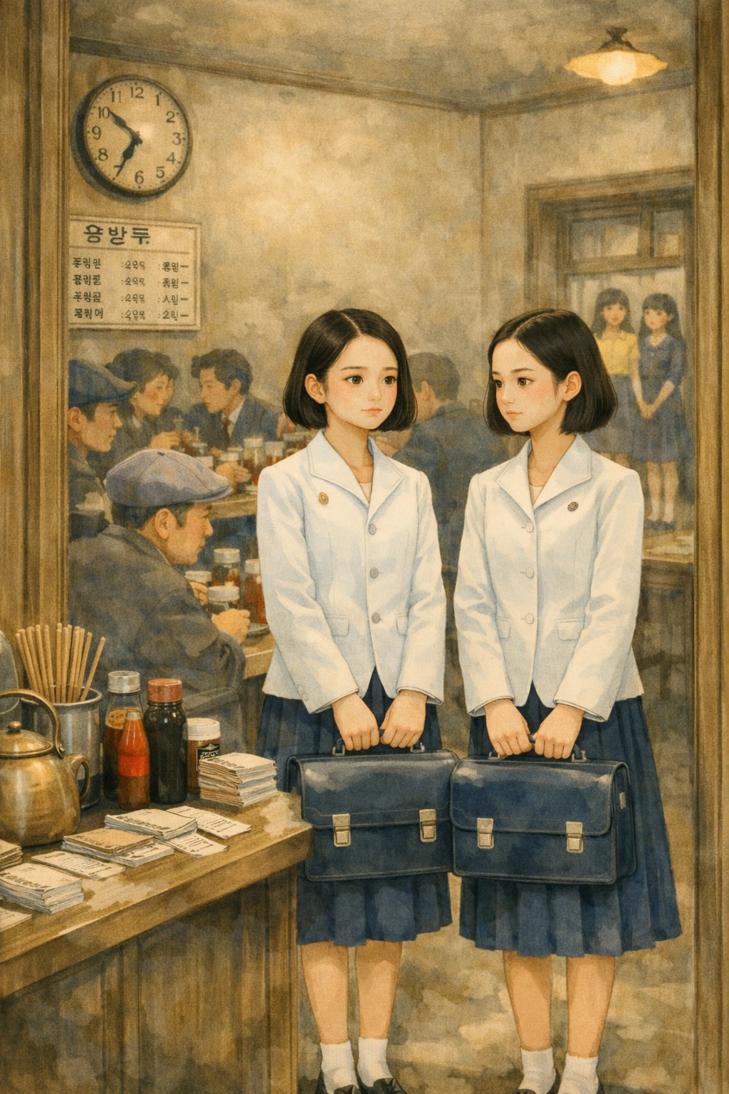 "어서 오십쇼!" 하는 종업원들의 절규 섞인 외침과 철제 수저가 그릇에 부딪히는 챙그랑 소리가 끊이지 않았지만, 카운터 너머로 보이는 규영의 부모님은 몰려드는 주문서를 쳐내느라 입구까지 들어선 두 소녀에게 눈길 한 번 주지 못했다.