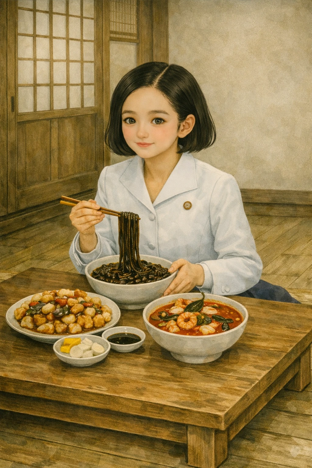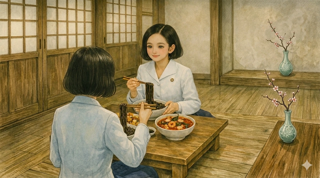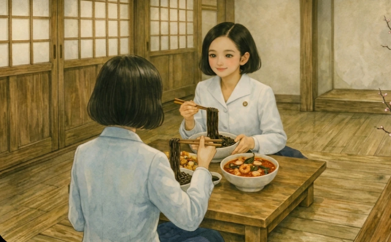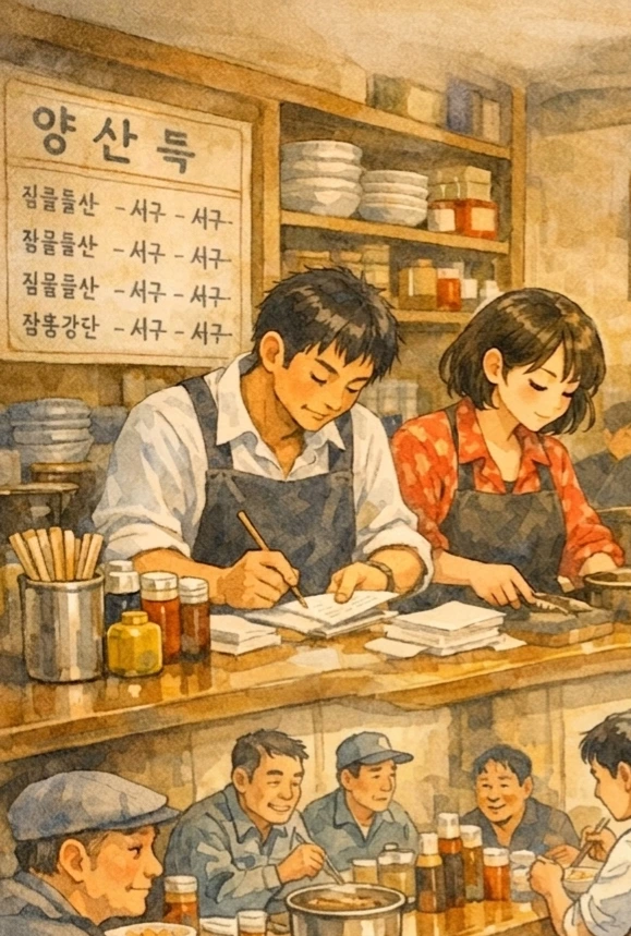 "어서 오십쇼!" 하는 종업원들의 절규 섞인 외침과 철제 수저가 그릇에 부딪히는 챙그랑 소리가 끊이지 않았지만, 카운터 너머로 보이는 규영의 부모님은 몰려드는 주문서를 쳐내느라 입구까지 들어선 두 소녀에게 눈길 한 번 주지 못했다.
