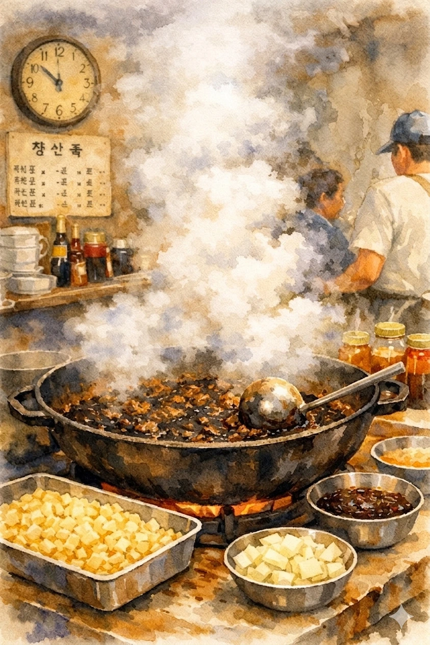 커다란 무쇠 솥에서 뿜어져 나오는 뽀얀 김과 달큰한 짜장 냄새, 알싸한 마늘 향이 뒤섞여 실내를 음식 내음으로 채우고 있었다.