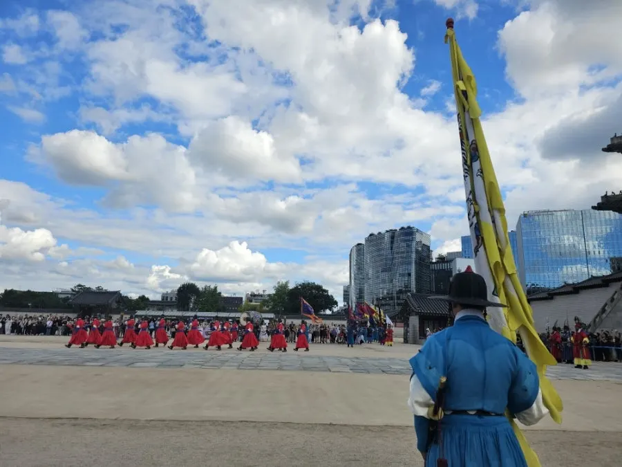 때마침 수문장 교대식이 있었다. 깊고 장엄한 북소리가 가을 하늘에 울려 퍼지고, 원색 복장을 갖춘 수문장들이 절도 있게 들어왔다. 흥례문 앞을 빽빽이 둘러싸고 숨을 고른 채 지켜보던 관광객들은 일제히 셔터를 눌렀다.