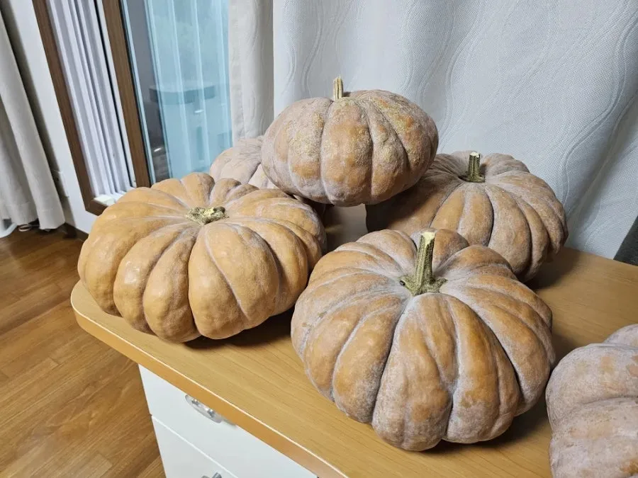 여름 뙤약볕과 땅기운을 가득 머금은 듯 누런 황금빛의 늙은 호박. 옴팍옴팍 골진 주름이 마치 커다란 꽃을 피운 듯한 모습. 몇 주 숙성이 되어 뽀얗게 분까지 올랐다. 펑퍼짐한 모양이 맷돌 같기도 하고 둥글고 예쁜 신데렐라 호박마차를 떠올리게도 한다.