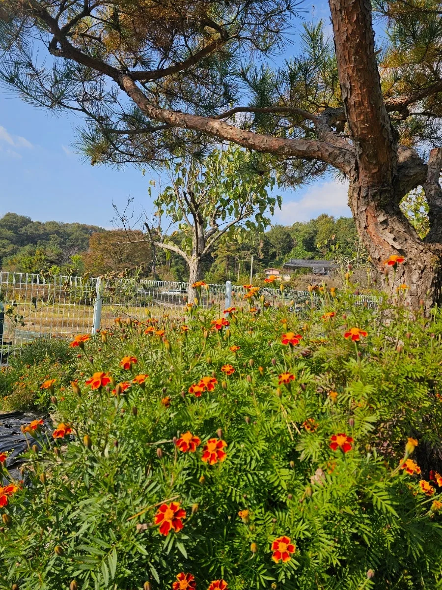 들판을 지나온 바람이 뽕나무 잎새를 흔들며 서걱거리고, 쌩하니 솔가지를 스치며 솔잎 하나 떨구고 간다. 메리골드 꽃밭에서 잠시 머물던 바람은 진한 향기를 실어다 놓고는 다시 들판으로 휘돌아 나가 텅 빈 논가에 서있는 억새를 춤추게 한다.