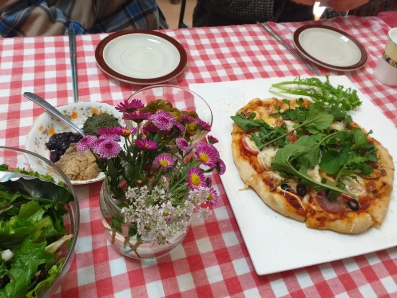 준비하는 사람들의 분주한 모습에선 사람 사는 냄새가 풍겨났다. 바삭한 피자, 가을향을 품은 야채 모둠 구이, 상큼한 샐러드, 따뜻한 꽃차, 모든 먹거리가 색색의 그림 같았다.