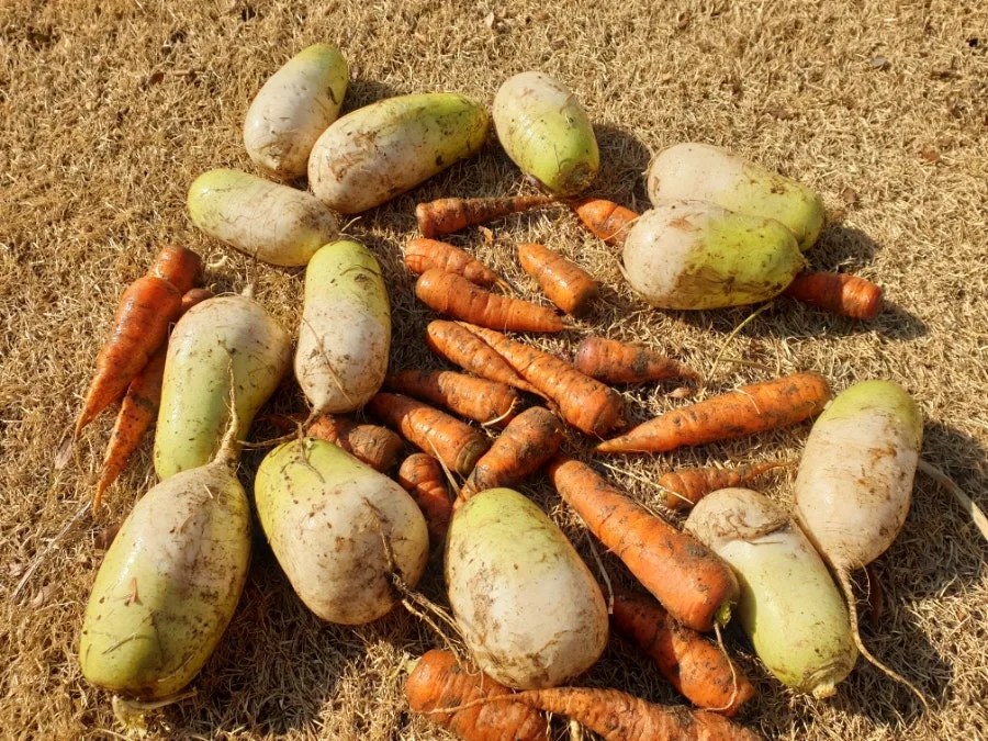 구덩이 속 볏짚을 걷어내자 뽀얀 몸통을 드러낸 무와 주황빛 당근이 마치 어제 묻은 것처럼 선명한 빛으로 옹기종기 모여 있었다. 지난가을, 김장하고 남은 것들을 묻은 것이다.