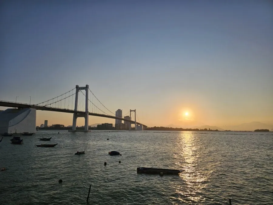 어느새 카페 근처 투안프억 현수교 너머로 하루가 저물고 있었다. 박미안 시장에서 보았던 잘 익은 파파야 속살 같은 주황빛 노을이 물 위로 고요히 번지고 있었다.