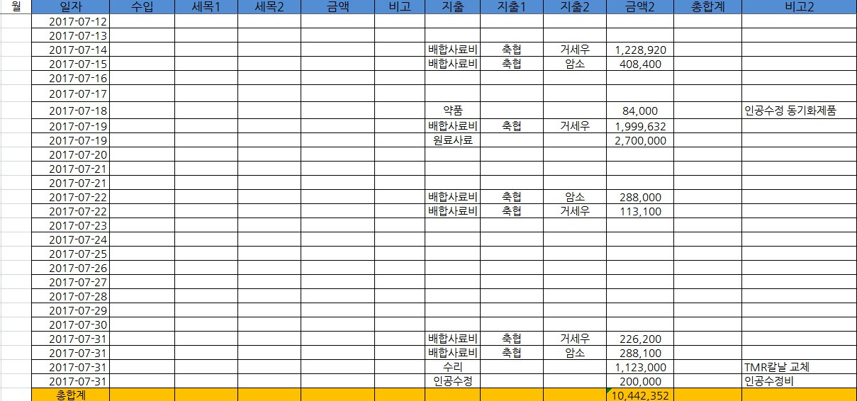 엑셀표를 보면 수입은 없고, 지출만 있다. 지출도 대부분 사료비인 것을 알 수 있다. 아직 우리 농장은 적자경영이다.