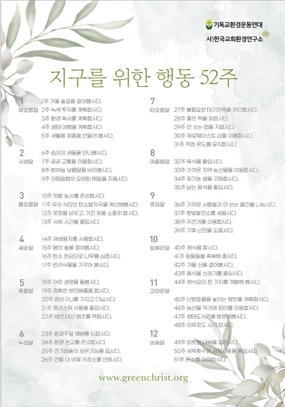 그래서 2022년도에는 기독교환경운동연대와 사)한국교회환경연구소에서 진행하는 “지구를 위한 행동 52주”에 동참하여 나름의 실천을 하려고 합니다. 아래 이미지에서 볼 수 있듯이 매주마다 지구를 위한 행동을 정해서 실천합니다. 물론 실천하려는 행동들 대다수가 일상의 작은 부분이기에, 그 일로 당장 세상이 변하지는 않겠지요. 그럼에도 작은 냇물이 모여 강을 이루고, 강이 모여 바다를 이루는 것처럼, 작은 실천들이 모일 때 변화와 평화가 이루어질 수 있습니다.