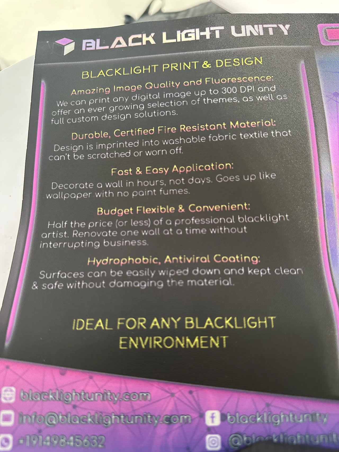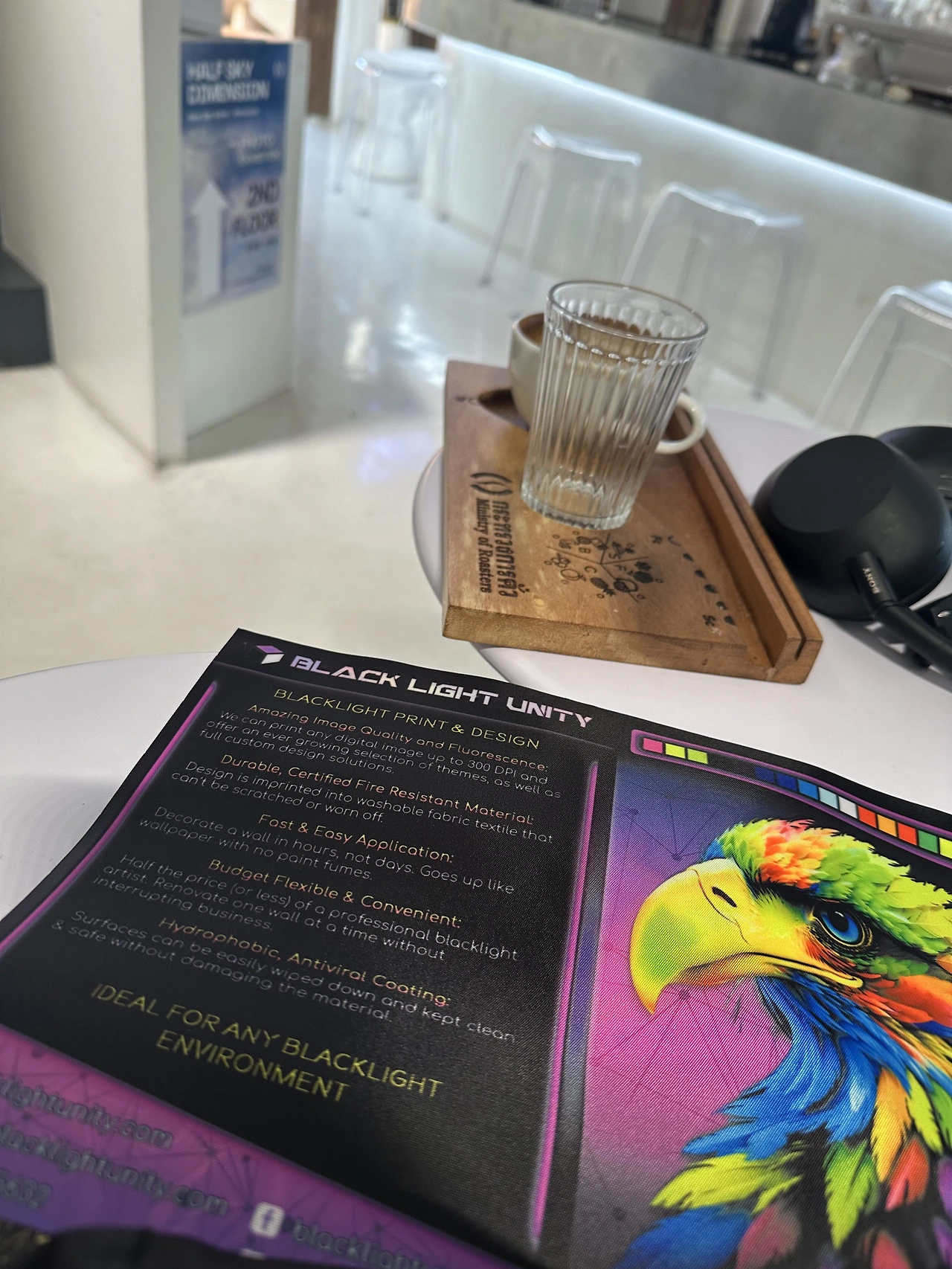 3~4가지 형광염료가 포함된 인쇄물을 벽에 설치하거나 굿즈등에 인쇄한 포트폴리오를 확인했다. 디자인 적으로 훌륭하지는 않았지만, 이 공간 연출 메커니즘에 나는 감탄했다.