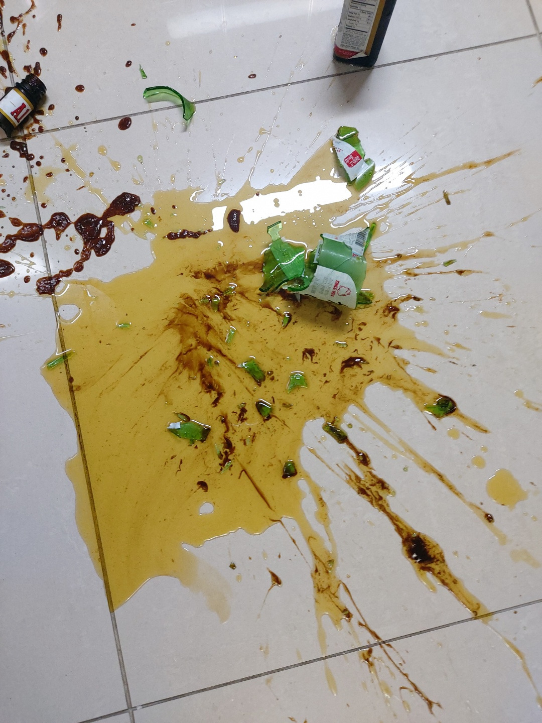 그 바람에 옆에 있던 들기름과 스테이크 소스가 바닥에 떨어져 바싹 깨져버렸다.