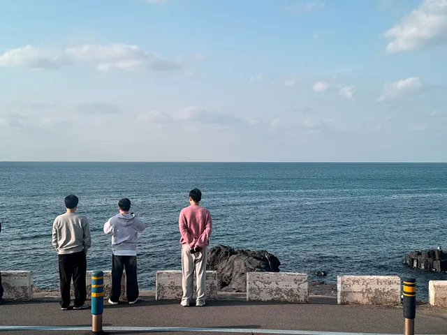숙소로 이동하기 전, 잠시 멈춘 해안 도로 앞에서 누군가는 바다를 배경으로 사진을 남기고, 누군가는 가족과 영상통화를 하며 각자의 방식으로 제주를 즐기고 있었습니다.