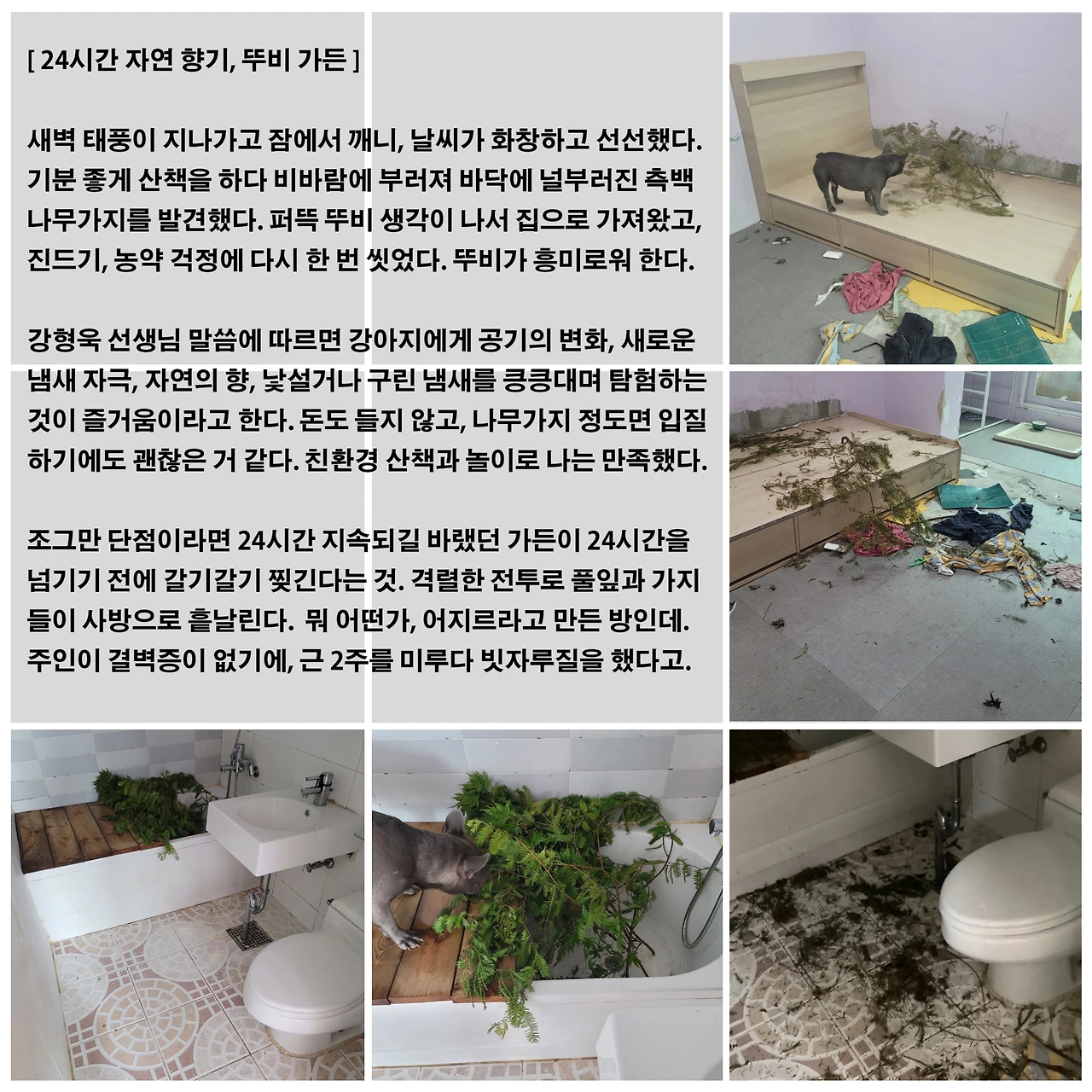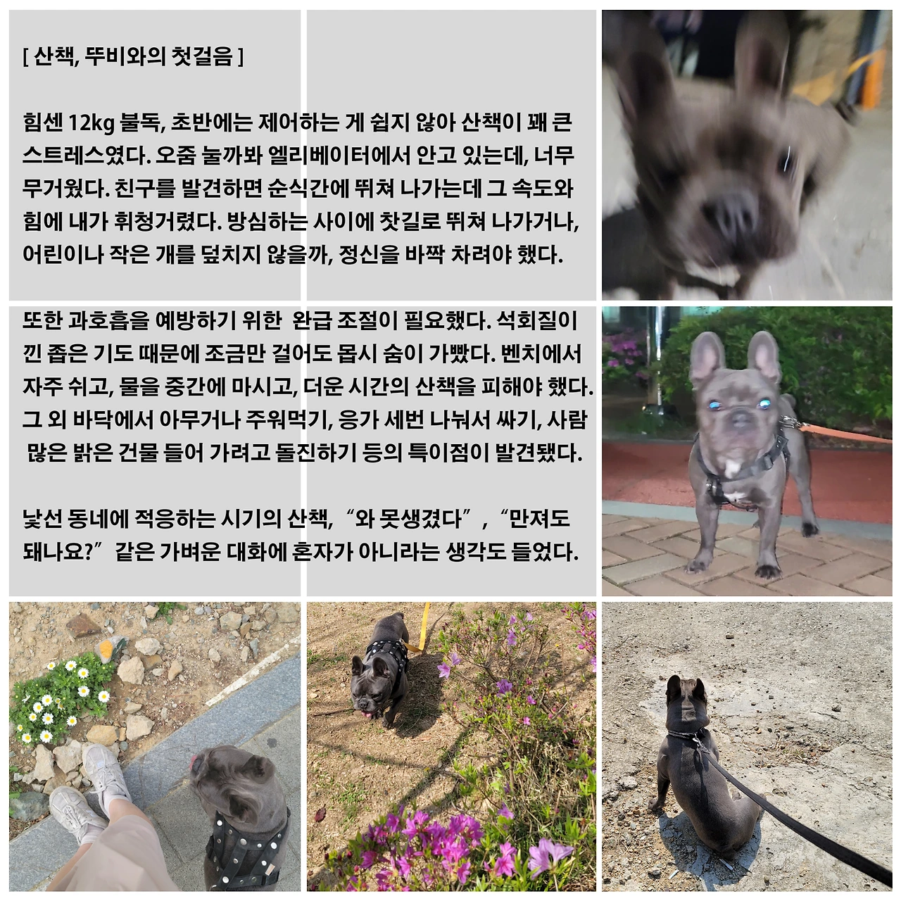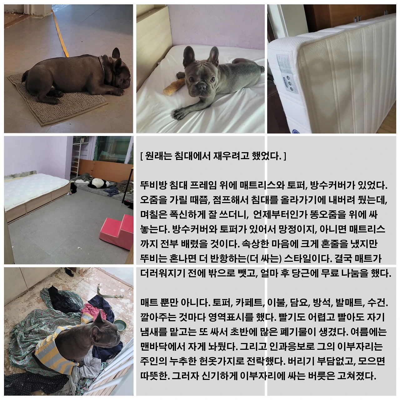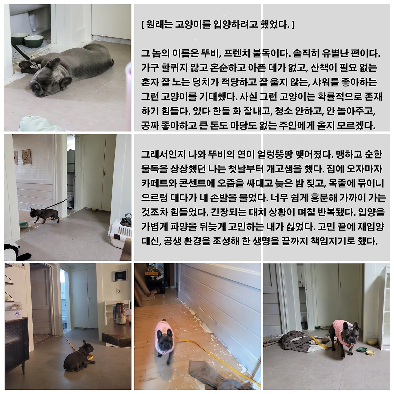 길에서 고양이가 콧물을 찔찔 흘리며 헤롱헤롱 걷고 있었다. 두리번거리다 슈퍼 안에 있는 주인 일지 모를 남자 분을 발견했다. “혹시 떠돌이 고양이면 제가 데려가도 되나요?” 알고 보니 그 분은 반려동물 입양을 주선하시는 분이셨는데, 고양이가 독감이 심해 열을 식히는 중이라고, 며칠 내로 죽을 것 같아 입양은 곤란하다고 하신다. 대신 다른 동물을 알아봐 주실 수 있다고 하셨고, 그게 뚜비의 입양으로 이어졌다. 처음 사진으로 본 뚜비는 무뚝뚝하고 잠만 잘 것 같은 인상이었다. 프렌치 불독에 대한 사전 지식이 없는 상태에서, 조금은 충동적으로 입양을 결정했다. 그리고 처음 데려온 날부터 심상치 않은 기싸움이 시작됐다. 뚜비는 생각보다 크고 무거워서 준비한 켄넬에 겨우 들어갔다. 어디로 갈지 모른다는 긴장감 때문이었는지, 공격적으로 짖어댔고 잠깐 들렸던 본가 할머니 방에 오줌을 쌌다. 우리 집에 데려오니 순식간에 거실에 오줌을 누고 물건들을 물어뜯기 시작했다. 가만 놔두면 소파고 테이블이고 다 부술 기세였다. ‘세상에 나쁜 개는 없다’는 TV프로에 자주 등장하는 ‘나쁜 개’를 내가 우리 집에 들인 건가, 싶어서 머리가 띵했다. 갓 리모델링이 끝난 소중한 내 집을 이 폭군이 갉아먹게 둘 수는 없었다. 어쩔 수 없이 삼일 정도는 뚜비를 화장실에 끈으로 묶어뒀다.