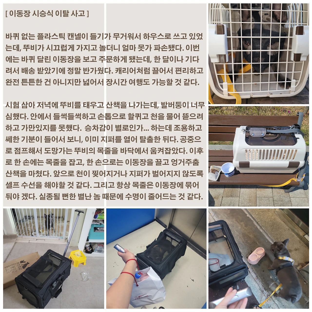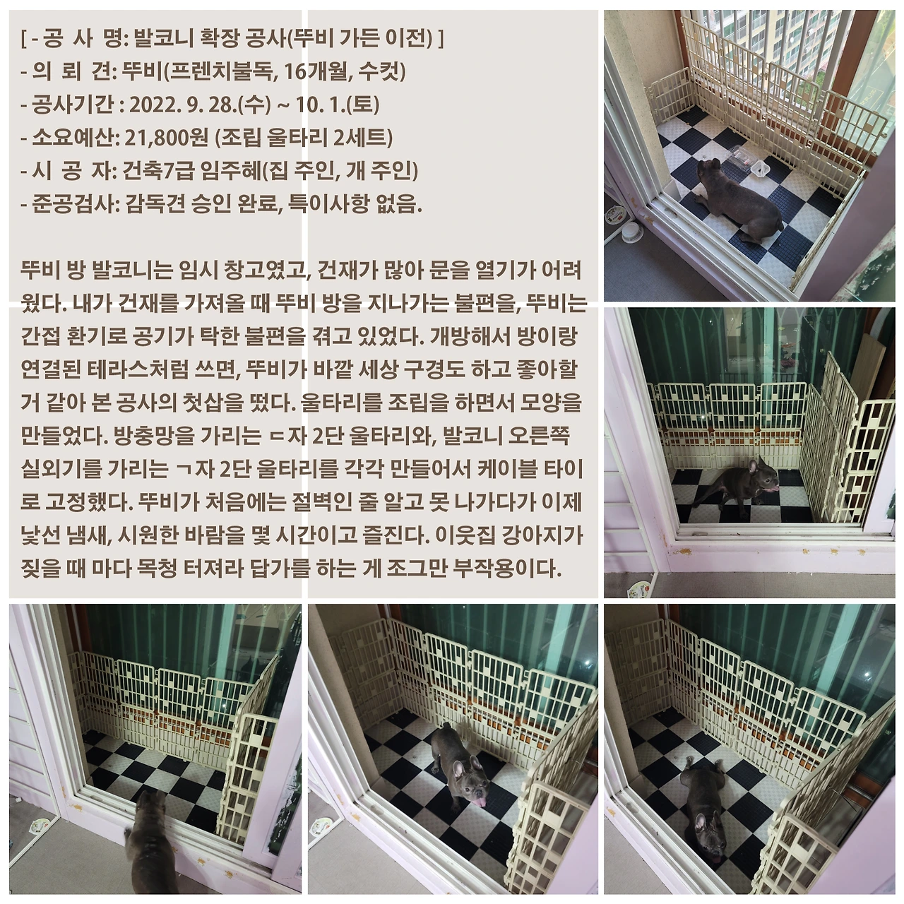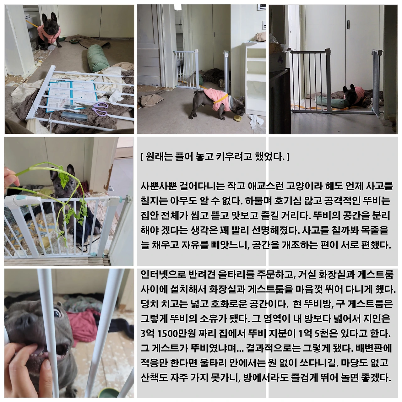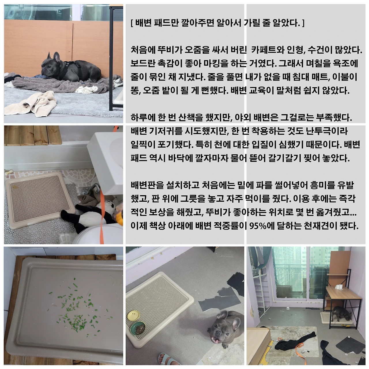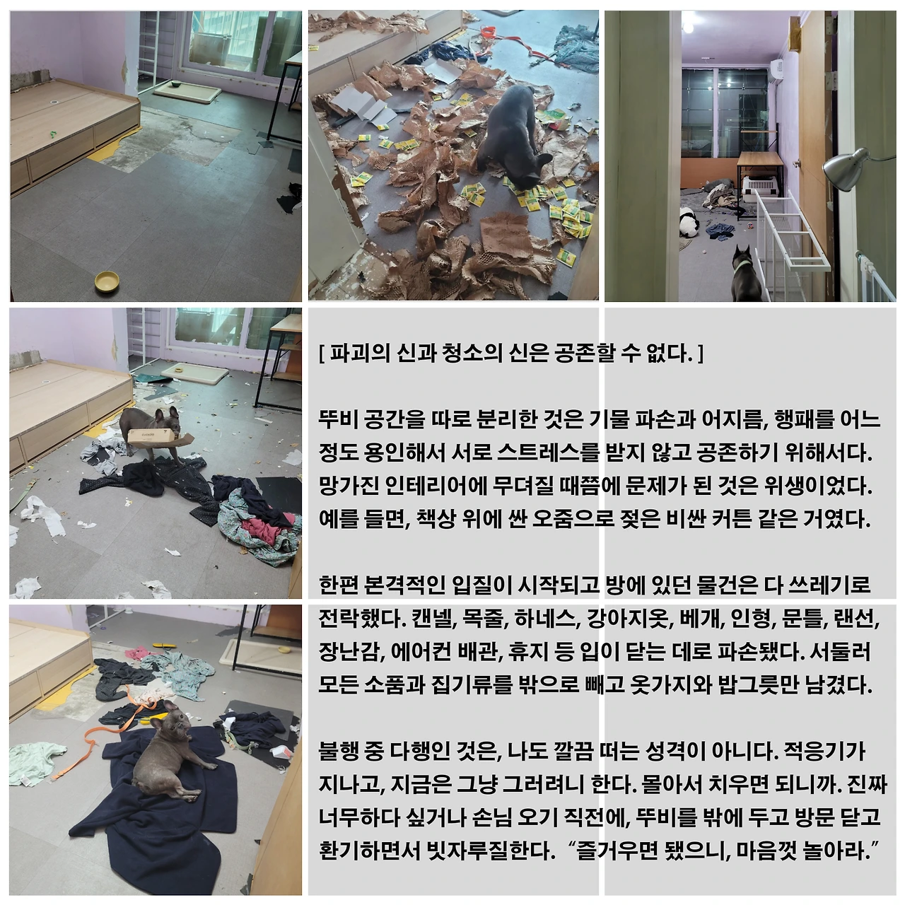 하루 종일 뚜비를 목줄로 묶어 놓는 건 너무 잔인한 일이라고 생각했다. 나는 공들인 인테리어를 유지하고 싶었고 뚜비는 물어뜯고 파괴하고 더럽힐 공간이 필요했다. 결국 내가 우리 집의 절반을 포기했고, 서로 분리된 경계와 각자의 영역을 갖기로 했다. 본격적인 공간 분리를 시작했고, 게스트룸과 거실 화장실을 뚜비가 자유롭게 돌아다닐 수 있도록 울타리를 설치했다. 소품이 그다지 없던 게스트룸이었지만 침대와 카펫이 영 신경 쓰였다. 언제든지 뚜비가 똥, 오줌을 쌀 수 있었고, 실제로 싸기도 했다. 배변판에 적응하는 데도 시간이 걸렸지만, 20%의 확률로 그냥 내키면 카펫에 오줌을 싸고는 했다. 이 때문에 정말 많이 화를 냈지만, 그런 바디랭귀지는 뚜비에게 공포감과 공격성만 심어줄 뿐이었다. 단 1%라도 배변 실수를 하면 침대와 카펫은 유지가 안 되는 걸 인정했다. 뚜비에게 적절한 환경이 아니었음을 인정하고, 매트리스는 당근에 무료 나눔을 하고, 카펫은 버렸다. 속이 후련했다. 이제 아기 강아지가 배변 실수를 해도 화내지 않아도 됐다. 애초에 패브릭에 배변을 싸지 말라는 것은 인간의 욕심일 뿐이었다. “미안해, 뚜비야. 배변판에 싸고, 실수 가끔 해도 돼!” 그 뒤로 한 달 넘게 배변판을 자주 갈아주고, 배변판 사용 후 보상을 철저히 해주니, 뚜비의 배변 실수는 0%에 수렴하게 됐다.
