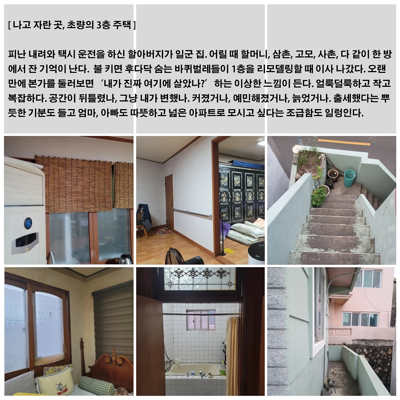 대중교통을 타기 어려웠던 동네, 모텔이 둘러싼 블록, 3중 주차로 새벽에도 차를 빼주러 나가던 낡은 빌라, 겨울에는 온수가 미지근했던 원룸, 소중한 자취방이었지만, 항상 상쾌하지는 않았다. 생각이 많아지는 밤에는 잠이 오지 않고 창문을 열면 아저씨들의 담배 냄새와 욕설이 난무했다.