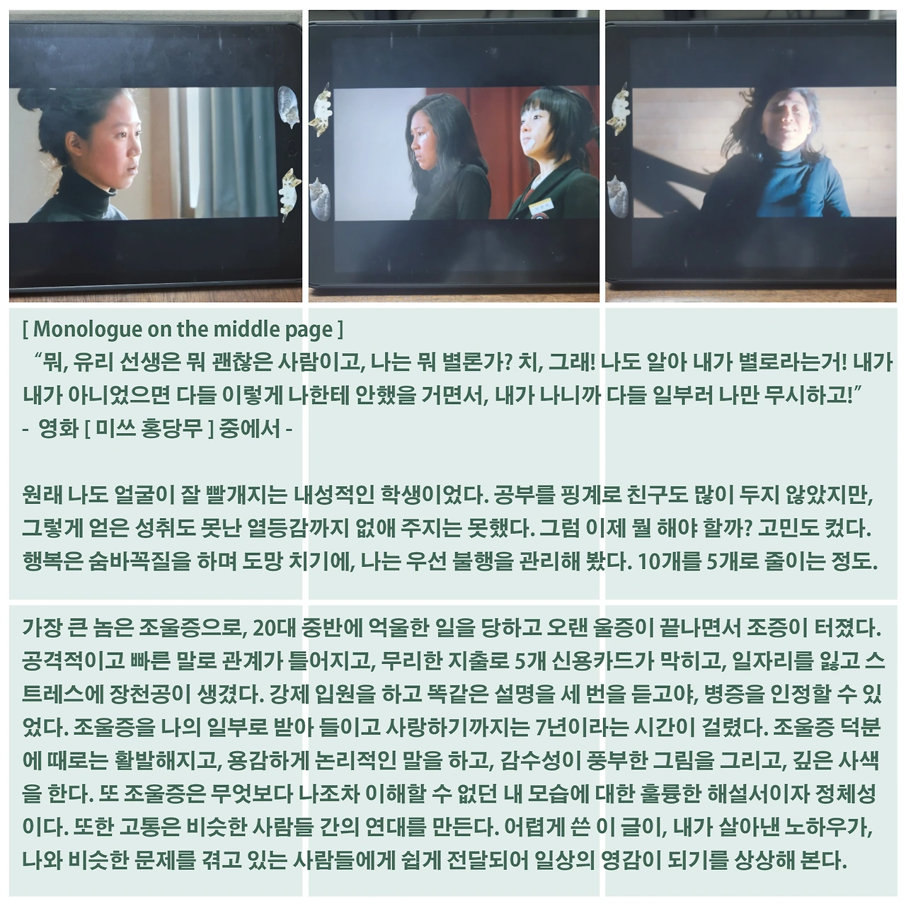 직장 일에도, 가사 노동에도 늘 성실했던 어머니는 무뚝뚝하지만, 항상 마음으로 나를 아끼시는 게 느껴진다. 하지만 가끔은 못 견디게 나를 찌르는 말투가 있었다. 엄마는 기본적으로 칭찬이나 애정 표현보다는 잔소리나 조언, 걱정이 먼저다. 한 번은 “조울증 약, 슬슬 끊는 게 어때?”라고 물어보신다. 질문 자체가 이상했다. 약의 용량이나 성분은 내 조증과 울증의 상태를 전문의가 분석하여 처방해 주는 것이지, 내가 원한다고 달라지는 것이 아니기 때문이다. 내가 약을 마음대로 먹거나 끊으면 조증이나 울증이 재발하여, 반사회적인 행동으로 강제 입원을 하게 될 수도 있다. 아마 엄마는 내가 보통의 또래 아가씨들처럼 약 없이도 생활하고, 결혼해서 아기도 낳길 바래서 그런 말을 했을 거다. 하지만 조울증은 유전 질환으로, ‘완치’보다는 ‘관리’ 개념에 가깝다. 결국 나는 “엄마가 어떻게 조울증에 이렇게 무지할 수 있냐.”며 크게 화를 내버렸다. 그건 사실 나에 대한 주체할 수 없는 분노였다. 조울증을 앓아, 다 크고 나서도 엄마를 이렇게나 걱정시키는 내 자신이 너무 초라했다. “다시 예전으로 돌아갈 수 없다니까! 그냥 이게 나라니까!”라고 소리를 지르자 엄마는 살짝 눈물까지 보였다.