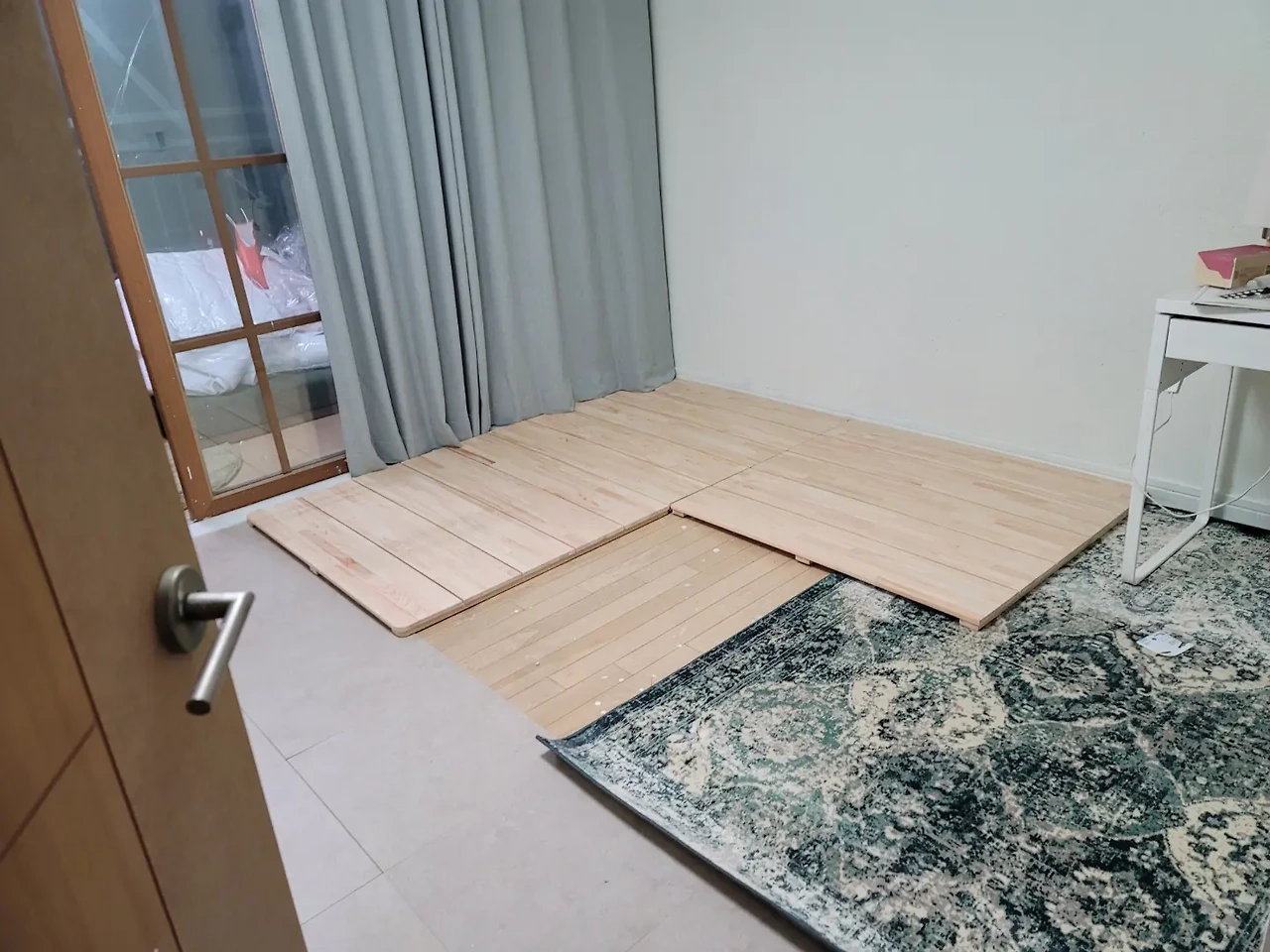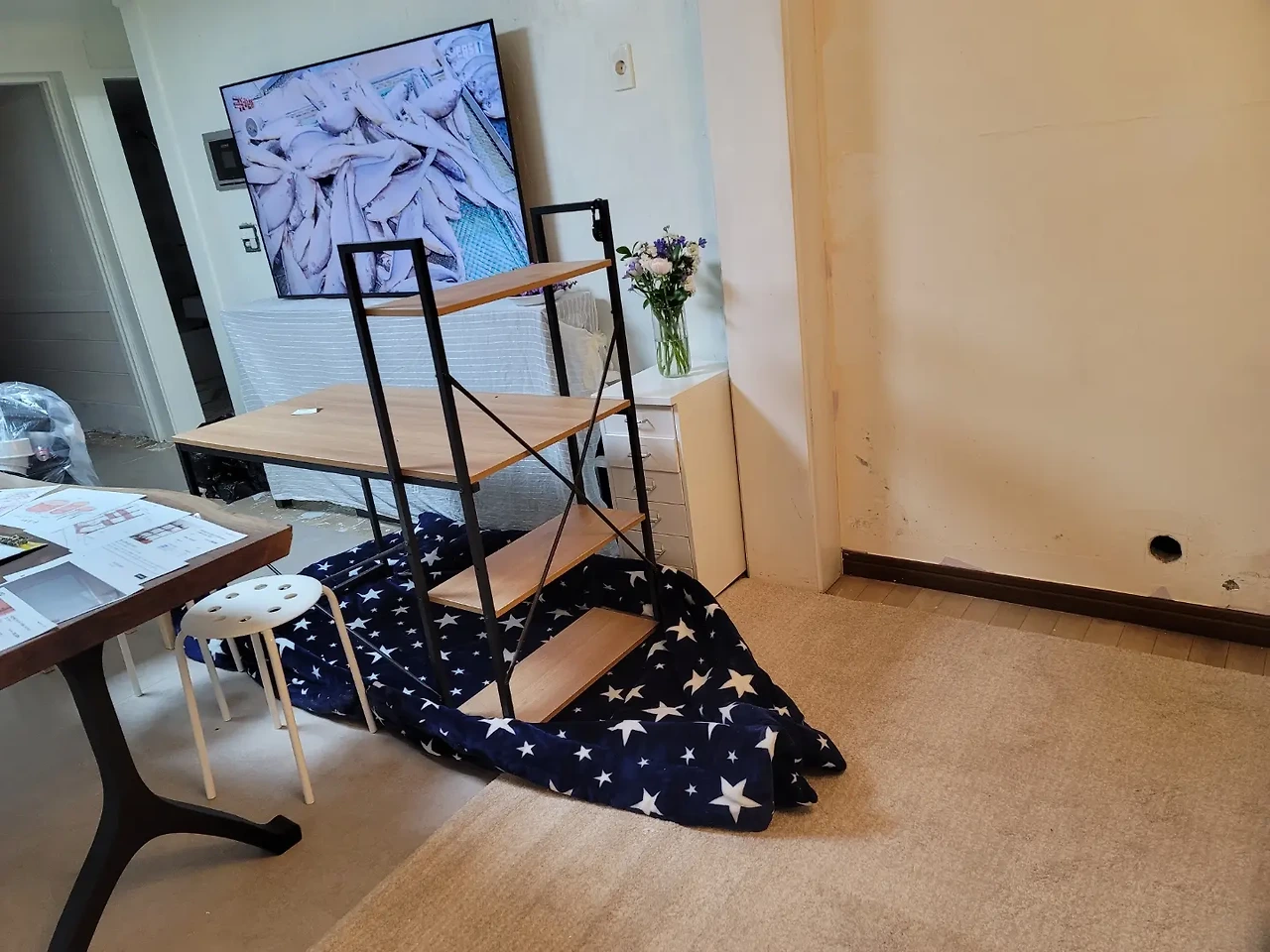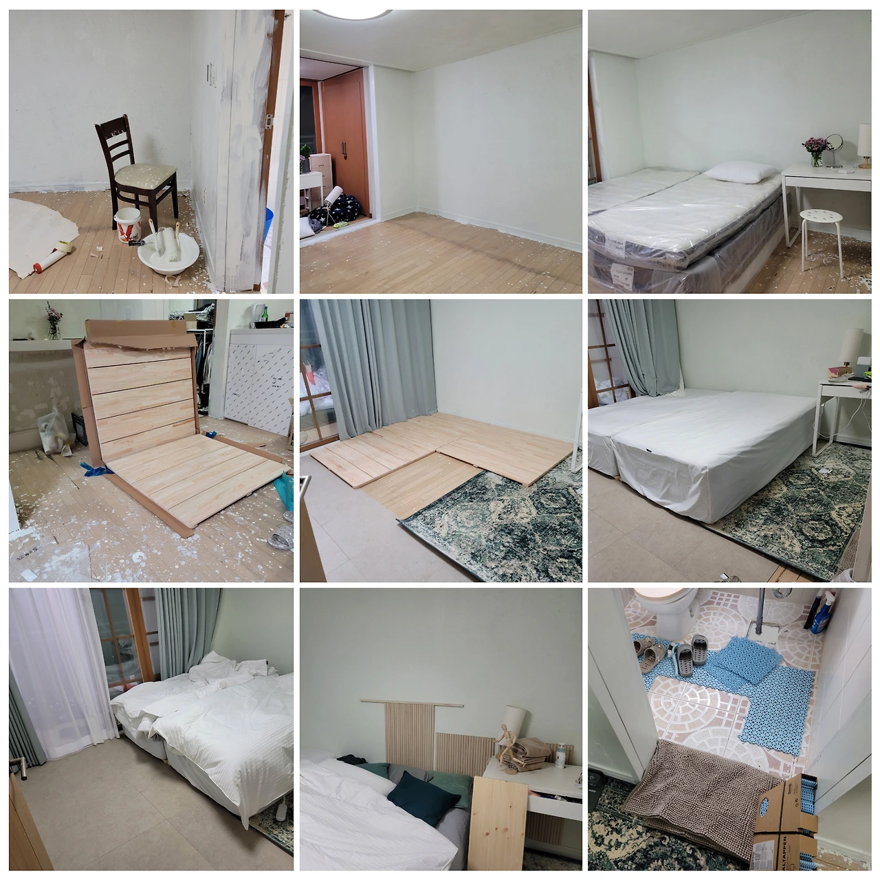 페인트 칠을 하기 전에 낡은 벽지를 뜯어야 벽지 결이 보이지 않고, 위생적일 거라 생각했다. 하지만 뜯고 보니 시멘트 먼지가 너무 많이 났고 콘크리트 표면에 뽀글뽀글한 기포 자국이 보였다. 그리고 천장은 벽지를 떼는 것 자체가 어려워서 철거를 포기했다. 모든 벽지를 깨끗하게 철거하고 퍼티로 콘크리트 요철을 정리하는 게 정석이지만, 나는 남은 벽지 위에 페인트를 두껍게 바르고 기포가 심각한 일부분만 퍼티를 했다. 어설프고 불규칙적인 퍼티 자국이 부끄러웠지만 ‘이런 게 빈티지 감성이지!’ 하며 흐린 눈을 뜨고 넘어갔다. 그때그때 이삿짐을 치우거나 보양해 가며 칠을 하는 것만 해도 고역이었다. 기존의 낡고 썩은 마루 바닥은 철거 난이도가 높아 그대로 둔 채로 덧방 시공을 하기로 했다. 바닥을 깨끗하게 닦고 45cm *45cm 데코타일을 본드로 붙였다. 타일이 얇은 것에 비해 무거웠지만, 커터칼로 자를 수 있어서 편했다. 수직 수평이 안 맞아 틈이 다소 벌어지기도 했지만, 이 또한 흐린 눈으로 보며 넘어갔다.