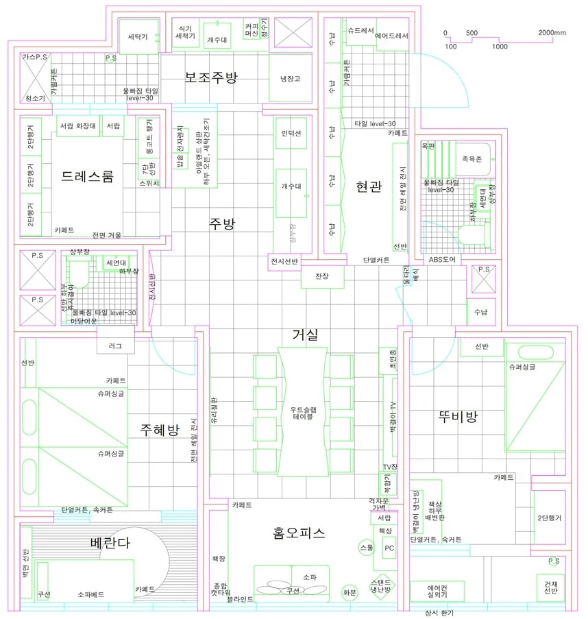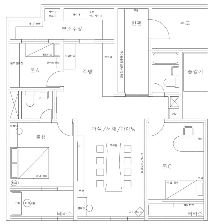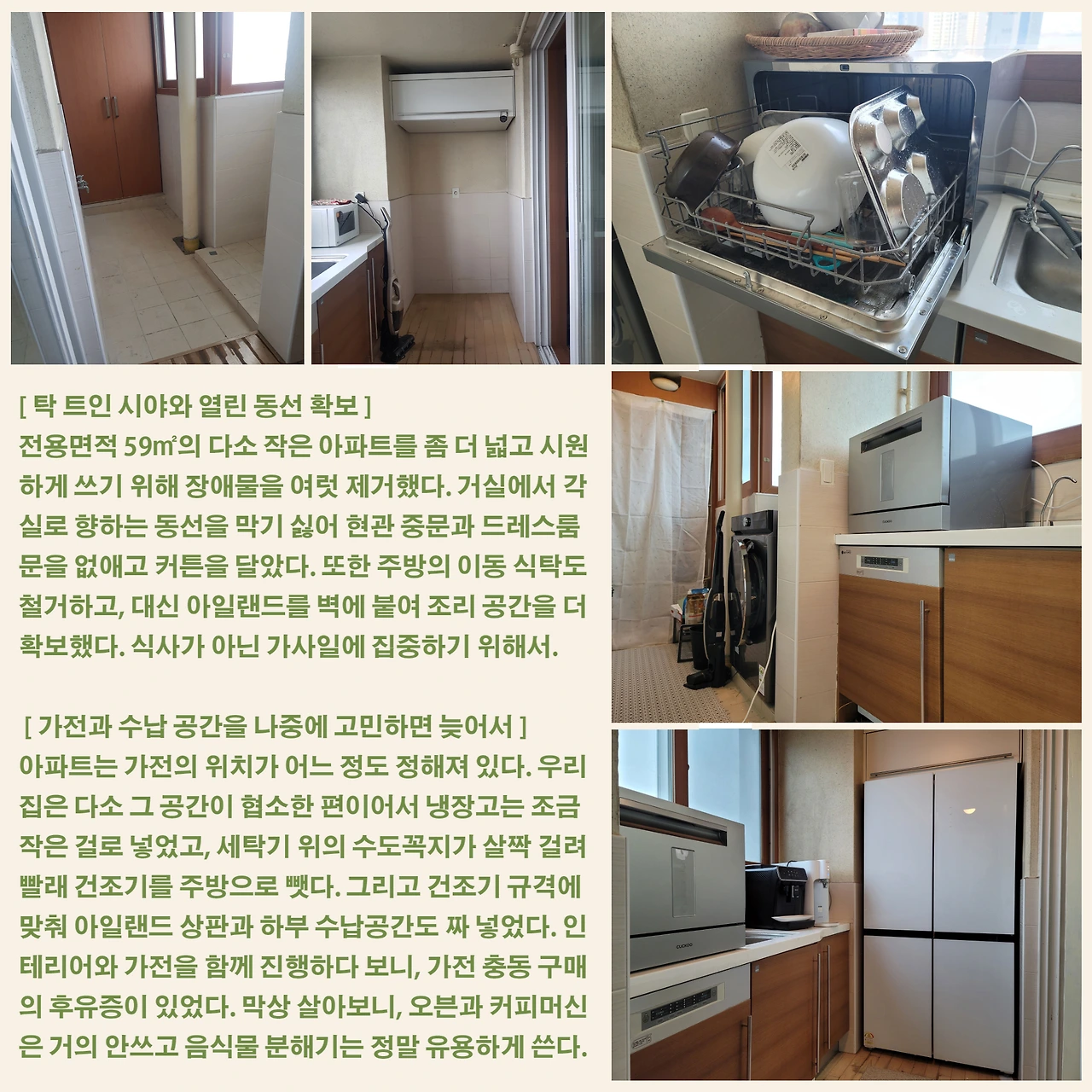 34. 통상적인 가구 배치 보다는, 자신의 라이프 스타일에 맞는 가구 배치가 효과적이다. (우리 집은 거실에 소파와 낮은 테이블이 없고, 주방에 식탁이 없다.)