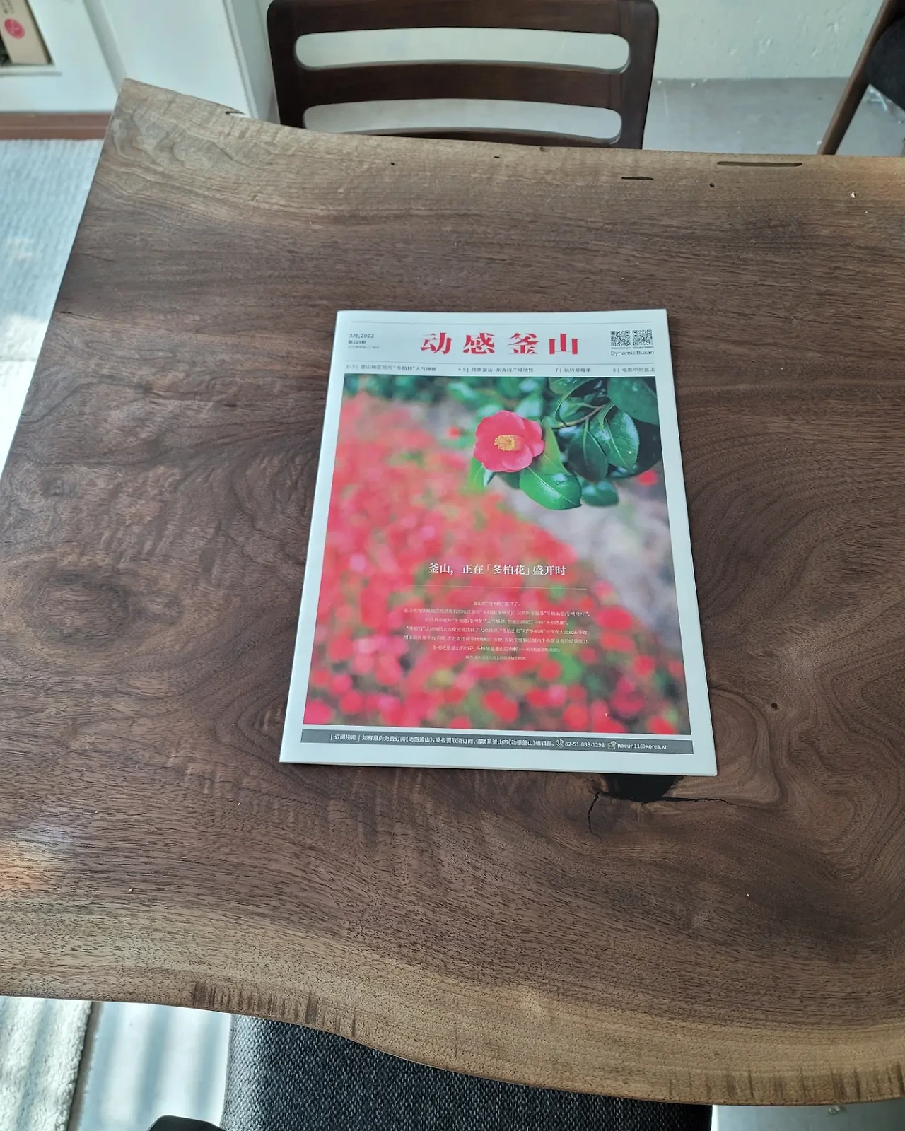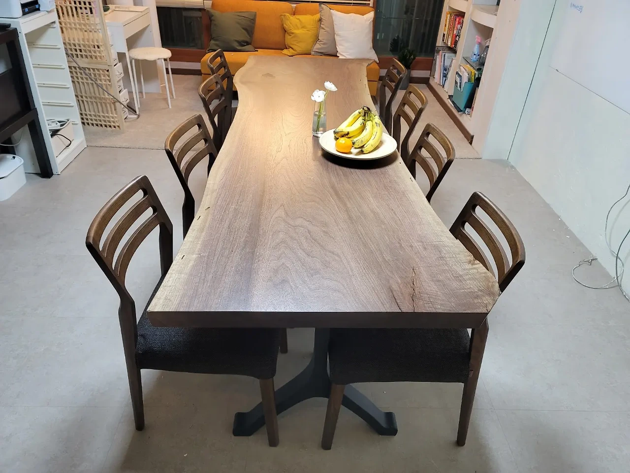 가장 자연스럽고 애착이 많이 가는 가구는 우드슬랩 테이블이다. 북미 월넛은 사람도 좋아하지만 벌레도 좋아한다고 한다. 벌레가 지나간 자국을 투명한 레진으로 메워 보존했다. 단면에서 거대한 나무의 시간을 느낄 수 있다. 유지관리를 잘해주면 거의 반영구적으로 쓸 수 있는 고급 가구다. 덕분에 우리 집안의 분위기가 꽤 고급스러워졌다. 벤치까지 세트로 하는 경우가 많은데, 나는 혼자 쓰지만 산만하게 움직이는 편이라 일반 의자를 배치했다.
